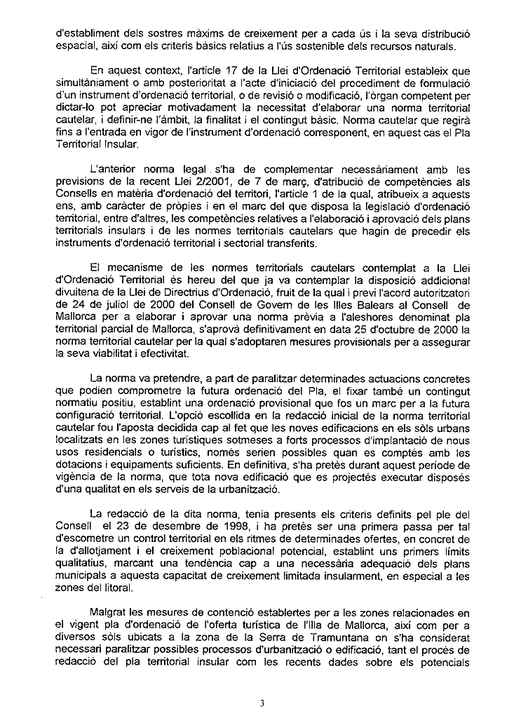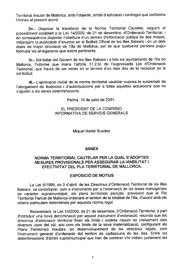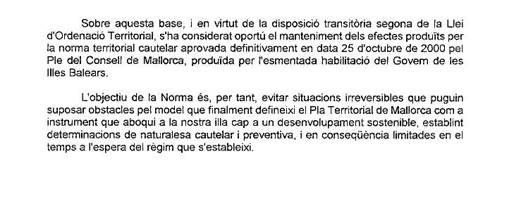 Adjuntam còpia del text íntegre de la "Norma Territorial Cautelar per la qual s'adopten mesures provisionals per assegurar la viabilitat i efectivitat del Pla Territorial de Mallorca, aprovada en data 9 de juliol de 2001, pel Consell Executiu del Consell Insular de Mallorca.