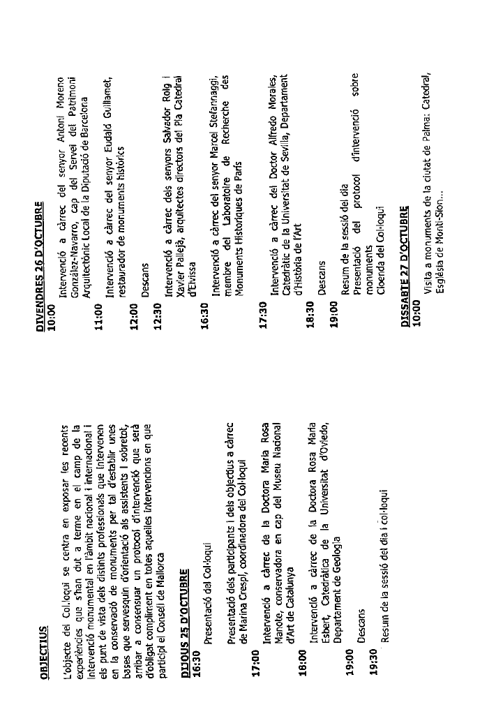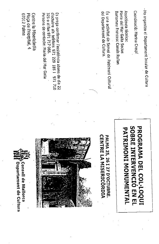 El Consell de Mallorca ha organitzat un col.loqui sobre Intervenció en el Patrimoni Monumental que se celebrarà els dies 25, 26 i 27 d'octubre de 2001, en el Centre Cultural de la Misericòrdia (Via Roma, 1 - Palma).