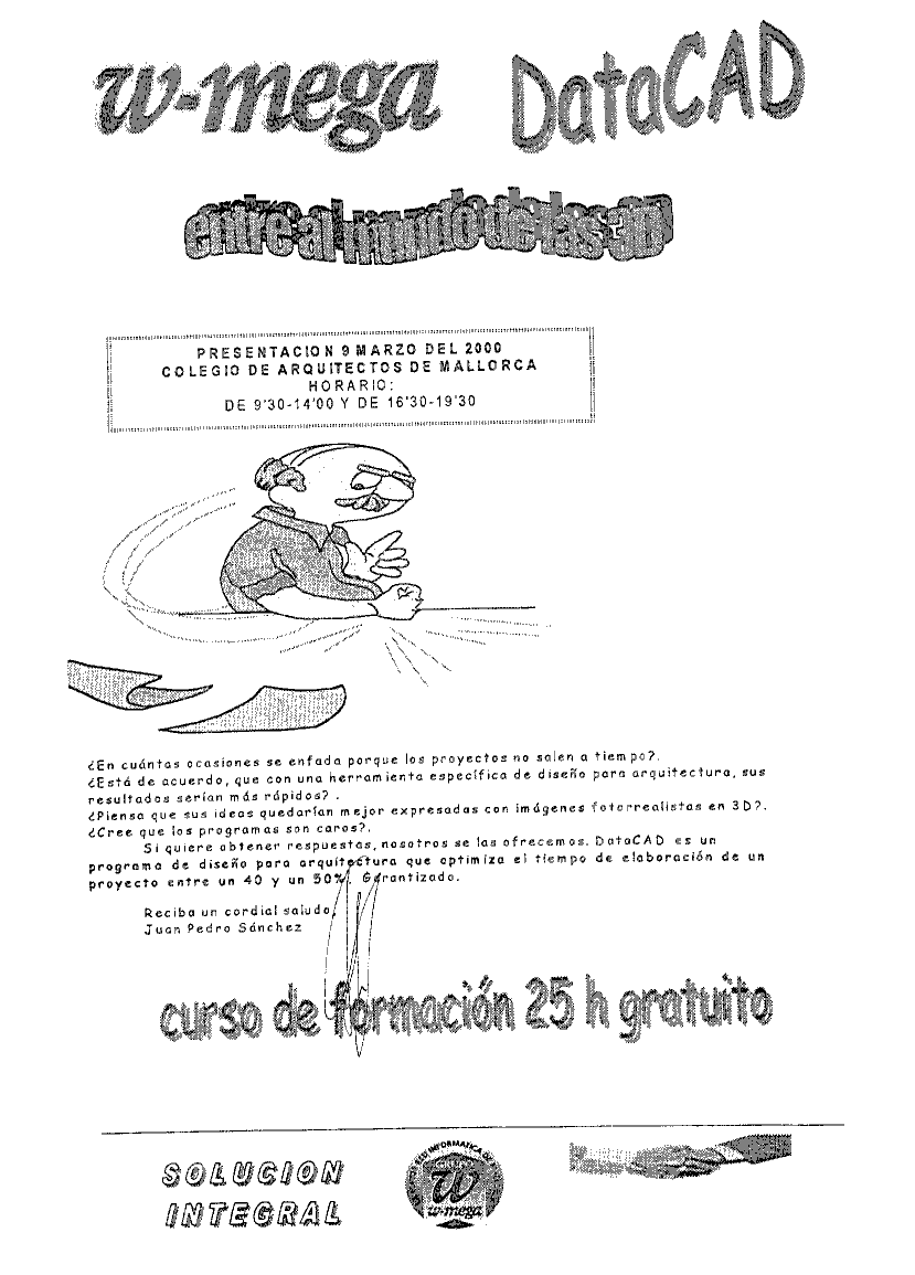 L'empresa DICAD ARQUITECTURA S.L. en col.laboració amb "W-Mega" realitzarà el dijous dia 9 de març de 2000, la presentació del programa de disseny d'arquitectura DataCAD, la qual es celebrarà a la seu col.legial de la Delegació Mallorca del COAB (Portella, 14)