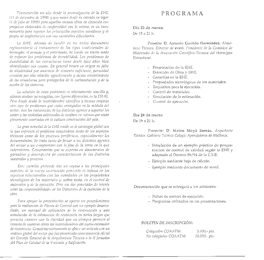El Colegio Oficial de Aparejadores y Arquitectos Técnicos de Mallorca (COAATM) ha organitzat un curs sobre "El Control de l' Execució segons la EHE", el qual es celebrarà els dies 22 i 24 de març de 2000.