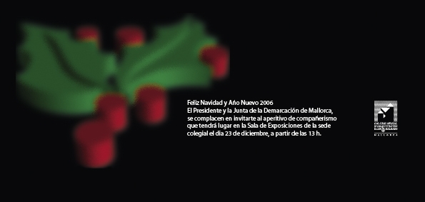 El Presidente y la Junta de la Demarcación Mallorca se complacen en invitarle al aperitivo de Navidad, que se celebrará el próximo Viernes, 23 de Diciembre de 2005, a partir de las 13 horas, en la Sala de Exposiciones del COAIB (Portella, 14 - 1º Planta).