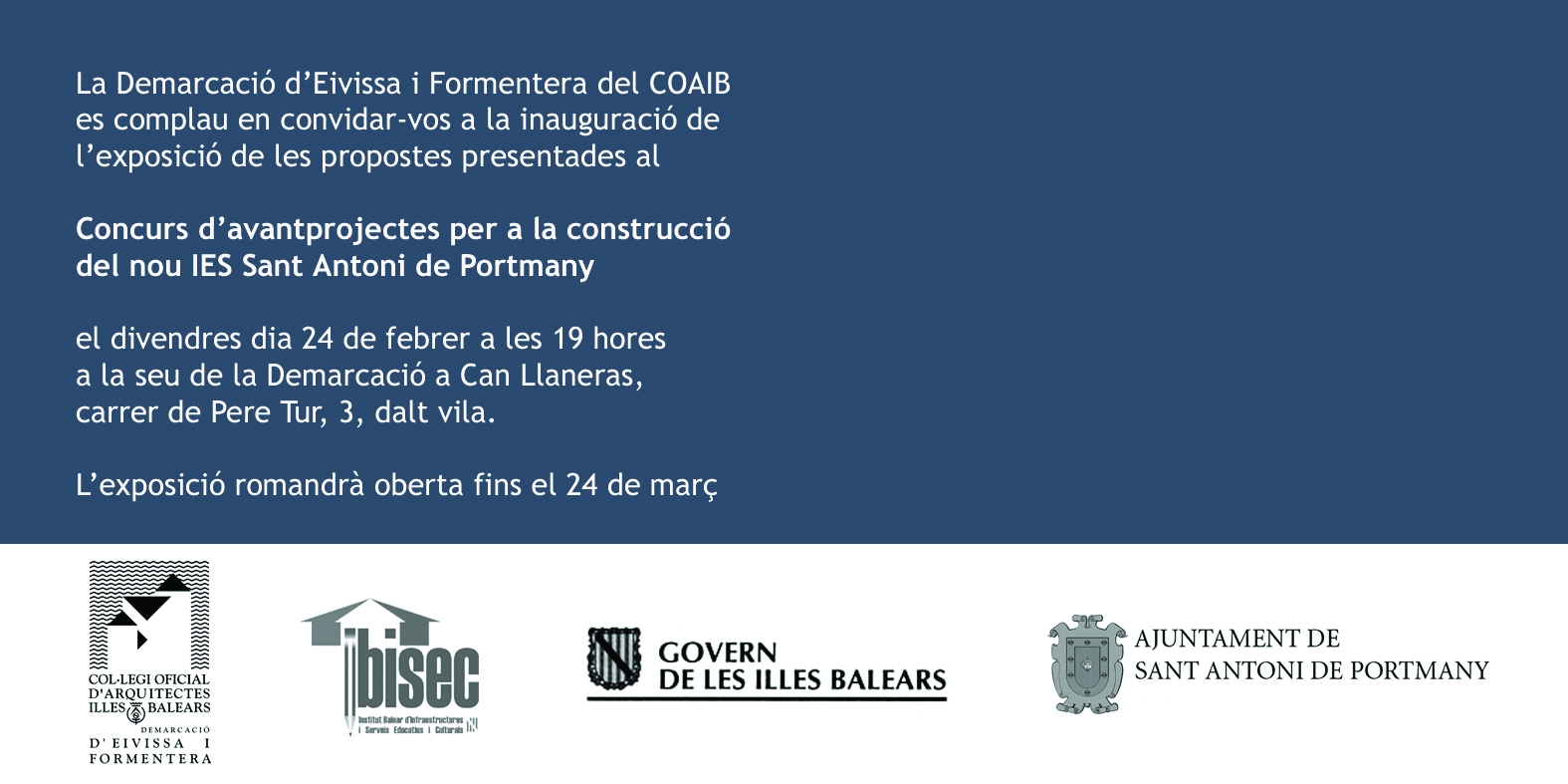 La Demarcación Eivissa-Formentera del COAIB se complace en invitarles a la inauguración de la exposición de las propuestas presentadas al "Concurso de anteproyectos para la construcción del nuevo IES Sant Antoni de Portmany", que tendrá lugar el próximo Viernes, 24 de Febrero de 2006, a las 19 horas, en la sede de la Demarcación.