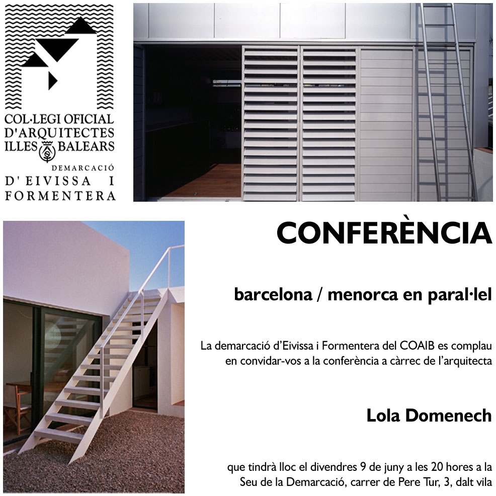 La Demarcación Eivissa-Formentera del COAIB se complace en invitarles a la conferencia "barcelona/menorca en paral·lel" a cargo de la arquitecta Lola Domenech, que se celebrará el próximo Viernes, 9 de Junio de 2006, a las 20 horas, en la sede de la Demarcación.