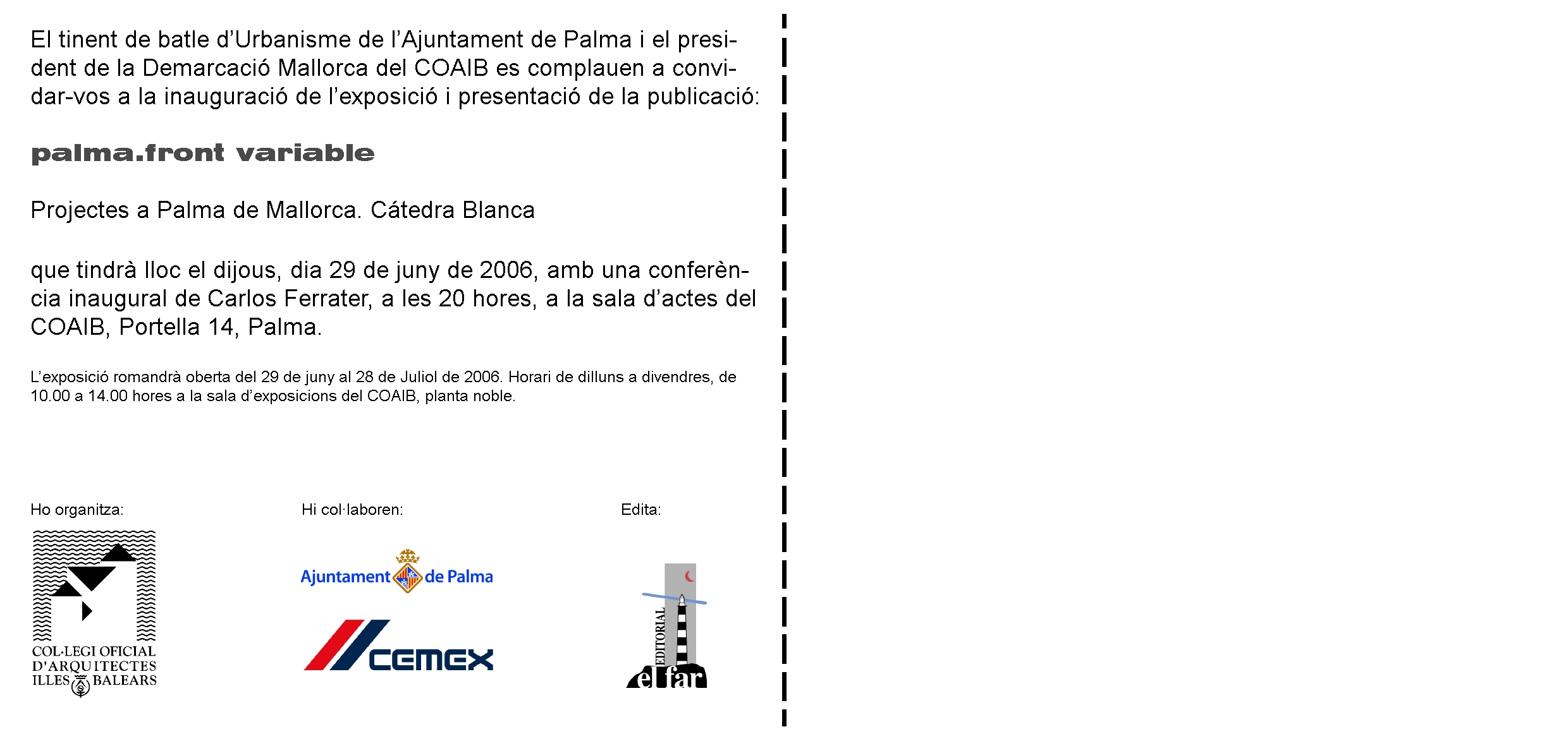 Durante el acto de inaguración que se celebrará el 29 de Junio de 2006, a las 20 horas, en el Salón de Actos del COAIB, el arquitecto y titular de la Cátedra Blanca, D. Carlos Ferrater, ofrecerá una conferencia bajo el título "Sincronizar la geometría: el tiempo de la geometría-geometría en el tiempo·.