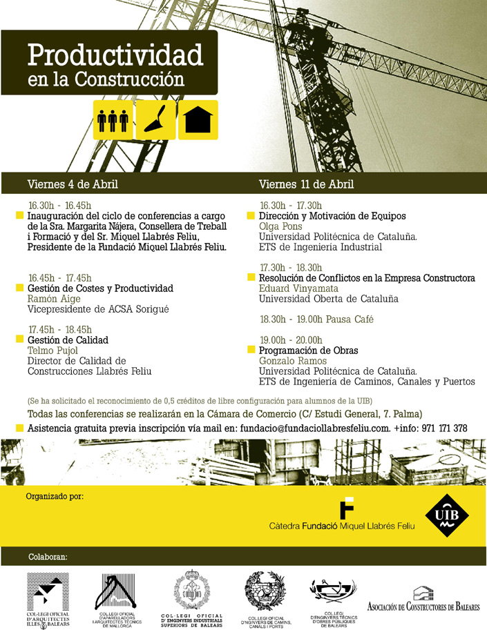 La Cátedra Fundació Miguel Llabrés Feliu, con la colaboración del COAIB y otras entidades, organiza un ciclo de conferencias sobre "Productividad en la construcción", que tendrá lugar los Viernes 4 y 11 de abril de 2008.