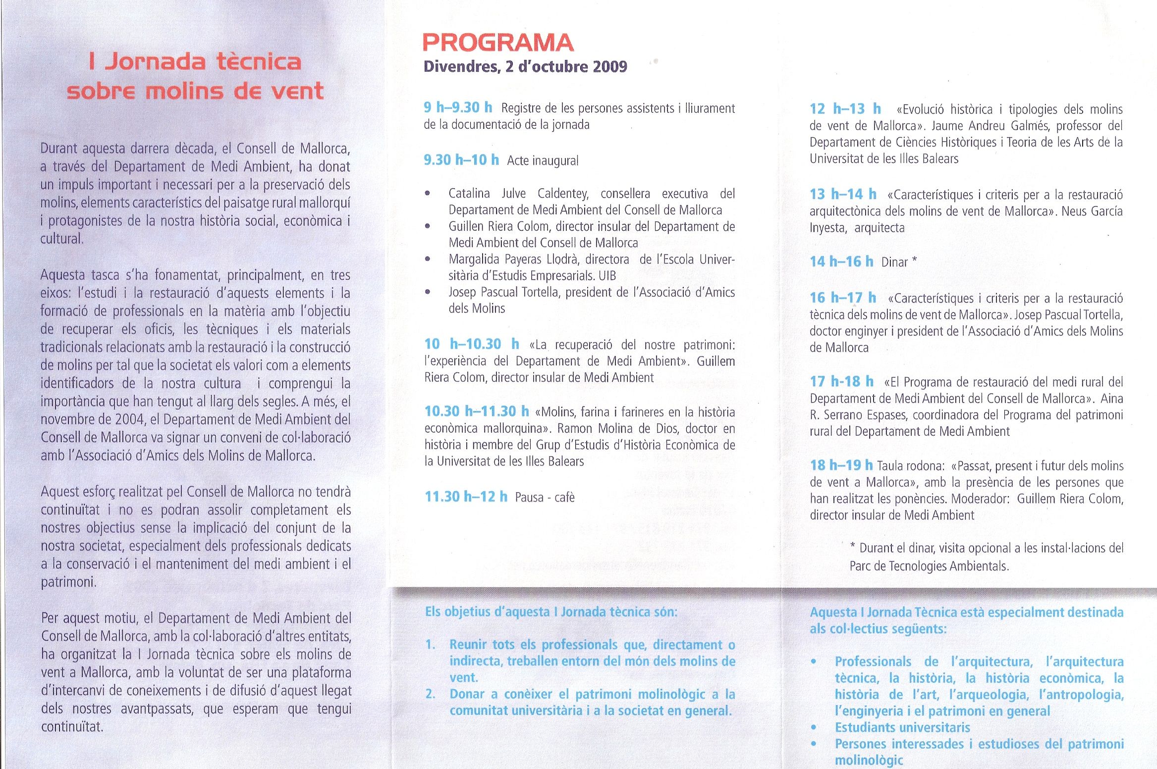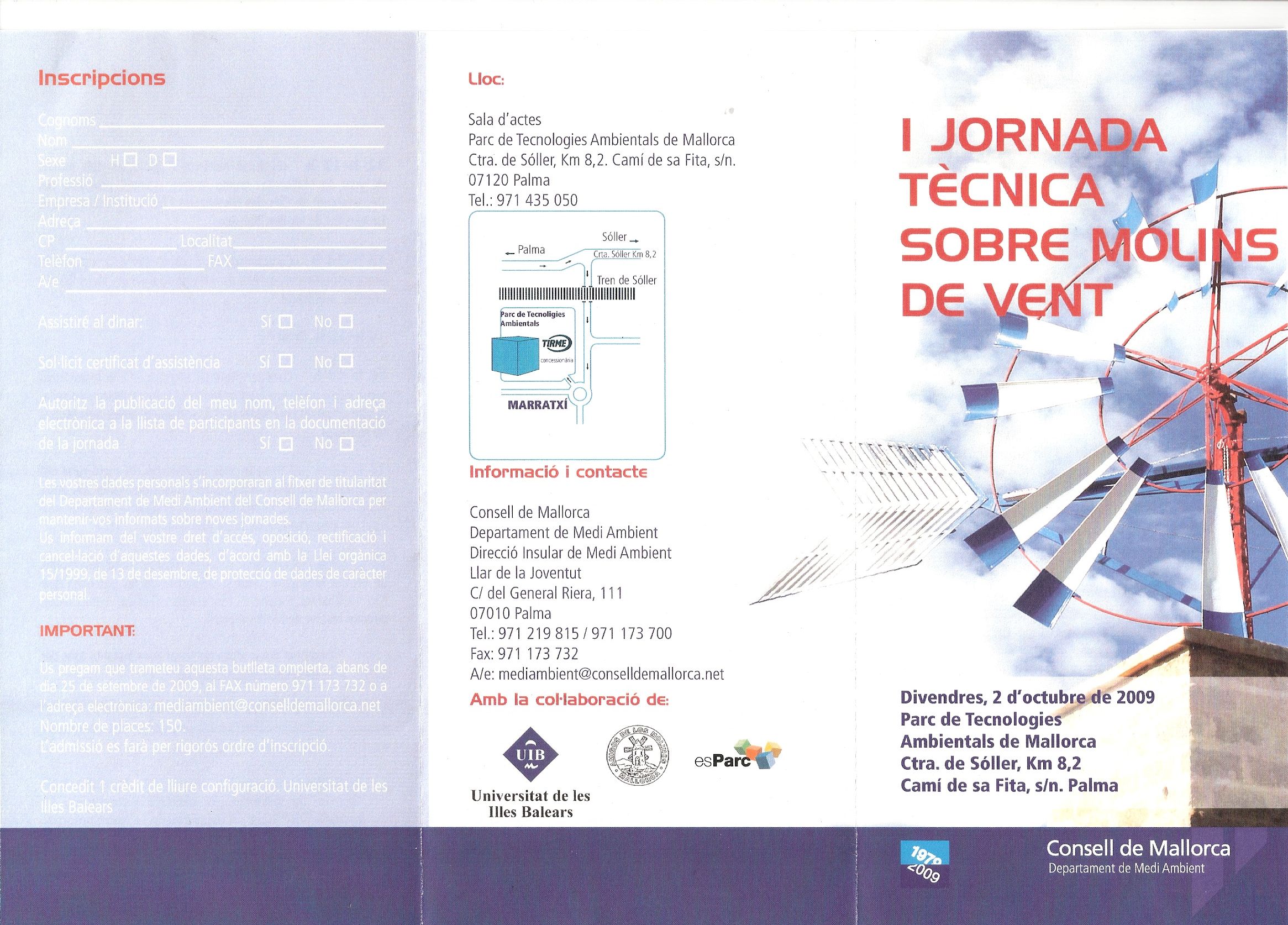 El Departamento de Medio Ambiente del Consell de Mallorca, en colaboración con la Universitat de les Illes Balears y la Associació d'Amics dels Molins de Mallorca ha organizado la I Jornada técnica sobre los molinos de viento en Mallorca que se celebrará el próximo 2 de octubre de 2009, en el salón de actos del Parque de Tecnologías Ambientales de Mallorca (Ctra.de Sóller, Km. 8,2. Camí de Sa Fita s/n)
