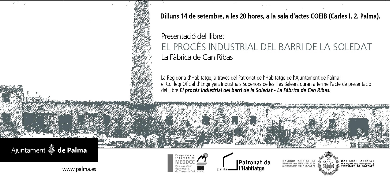 La Alcaldesa de Palma y el Decano del Col·legi Oficial d'Enginyers Industrials Superiors de les Illes Balears se complacen en invitarles al acto de presentación del libro "El procés industrial del barri de la Soledat- La fàbrica de Can Ribas" que se celebrará el próximo Lunes, 14 de septiembre de 2009, a las 20 horas, en el salón de actos de la sede central del COEIB (Carles I, 2 - Palma).