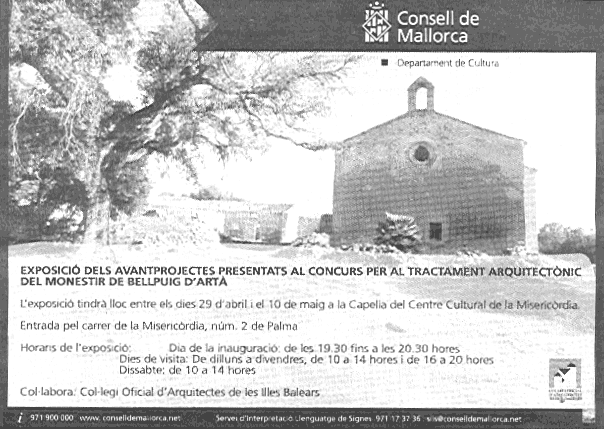 El COAIB a través de la Demarcación Mallorca y el Consell de Mallorca, organizan la exposición de los trabajos presentados al "Concurso de Anteproyectos, de tratamiento arquitectónico, del antiguo monasterio de Bellpuig, Artà" convocado por el Consell de Mallorca.