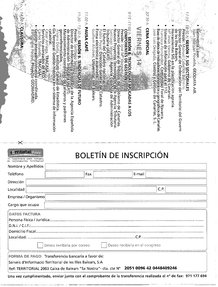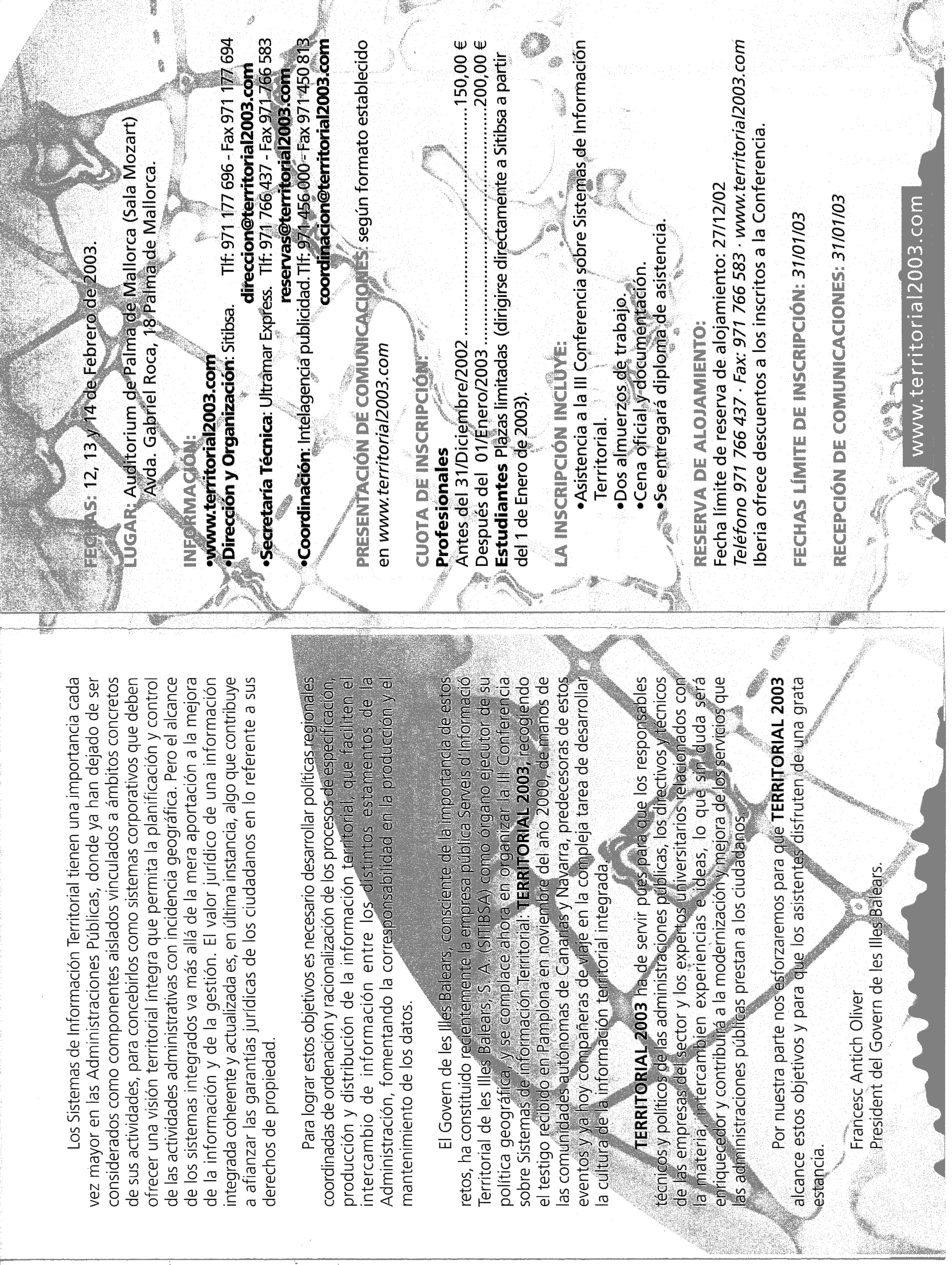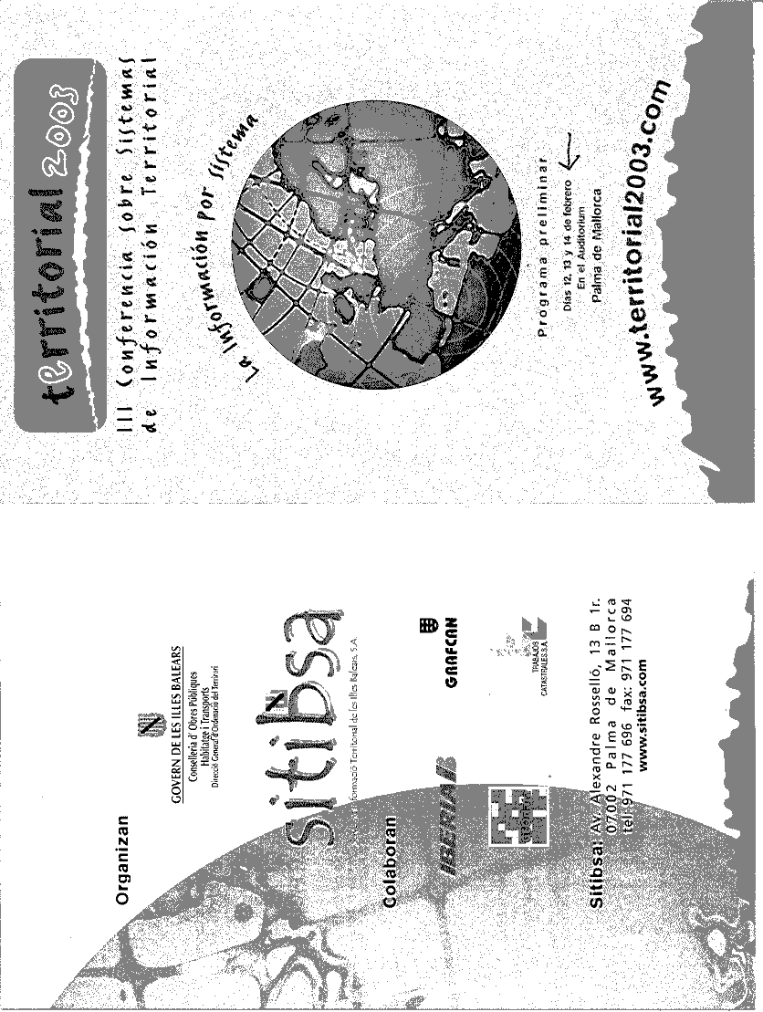 El Govern de les Illes Balears, ha constituido recientemente la emplesa pública de Serveis d'Informació Territorial de les Illes Balears, S.A. (SITIBSA) como órgano ejecutor de su política geográfica, y se complace ahora en organizar la III Conferencia sobre Sistemas de Información Territoiral : TERRITORIAL 2003.