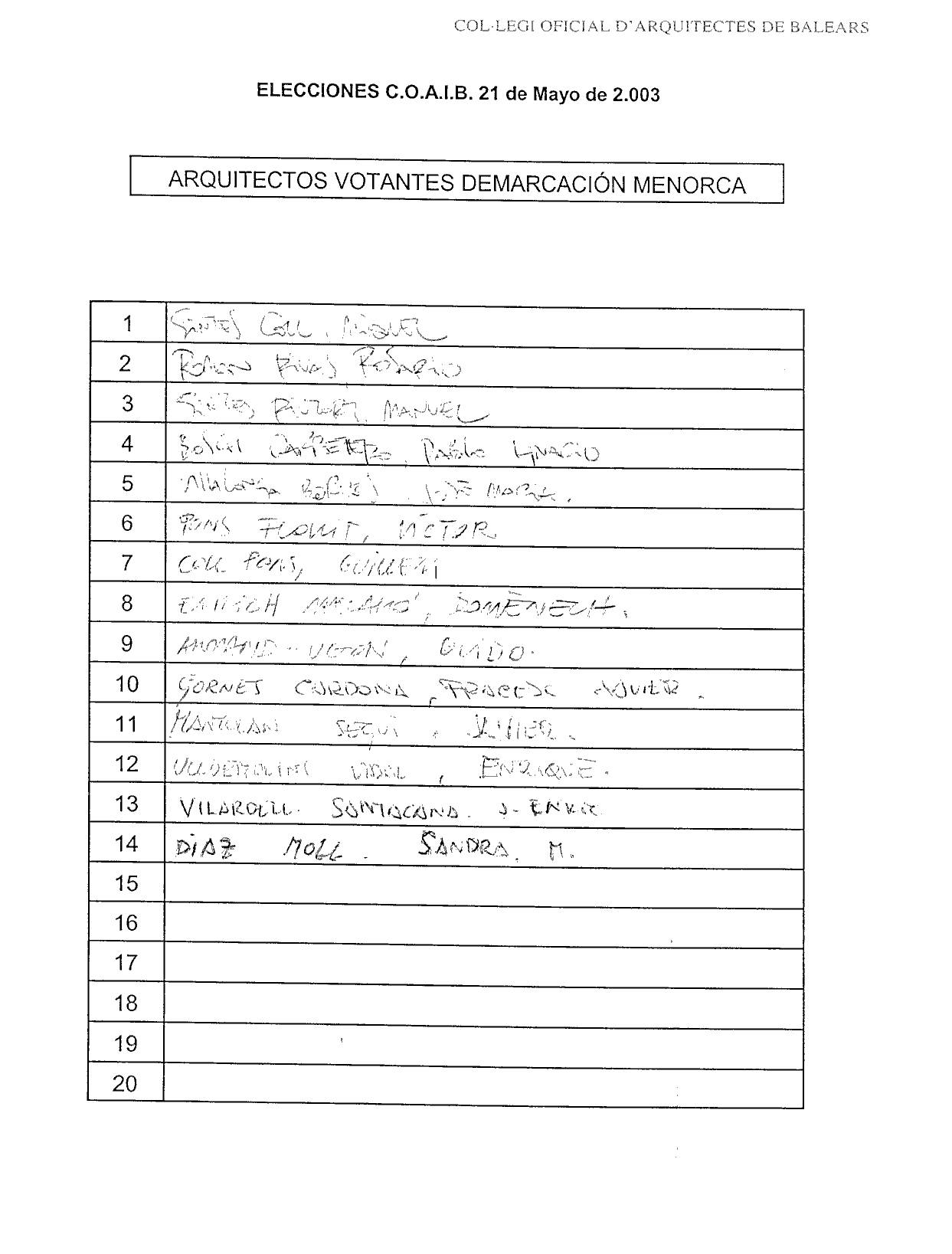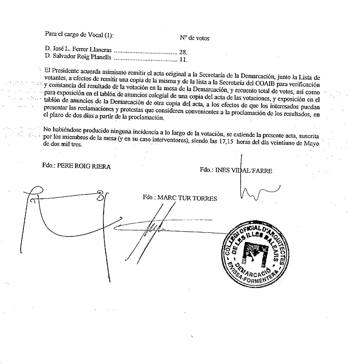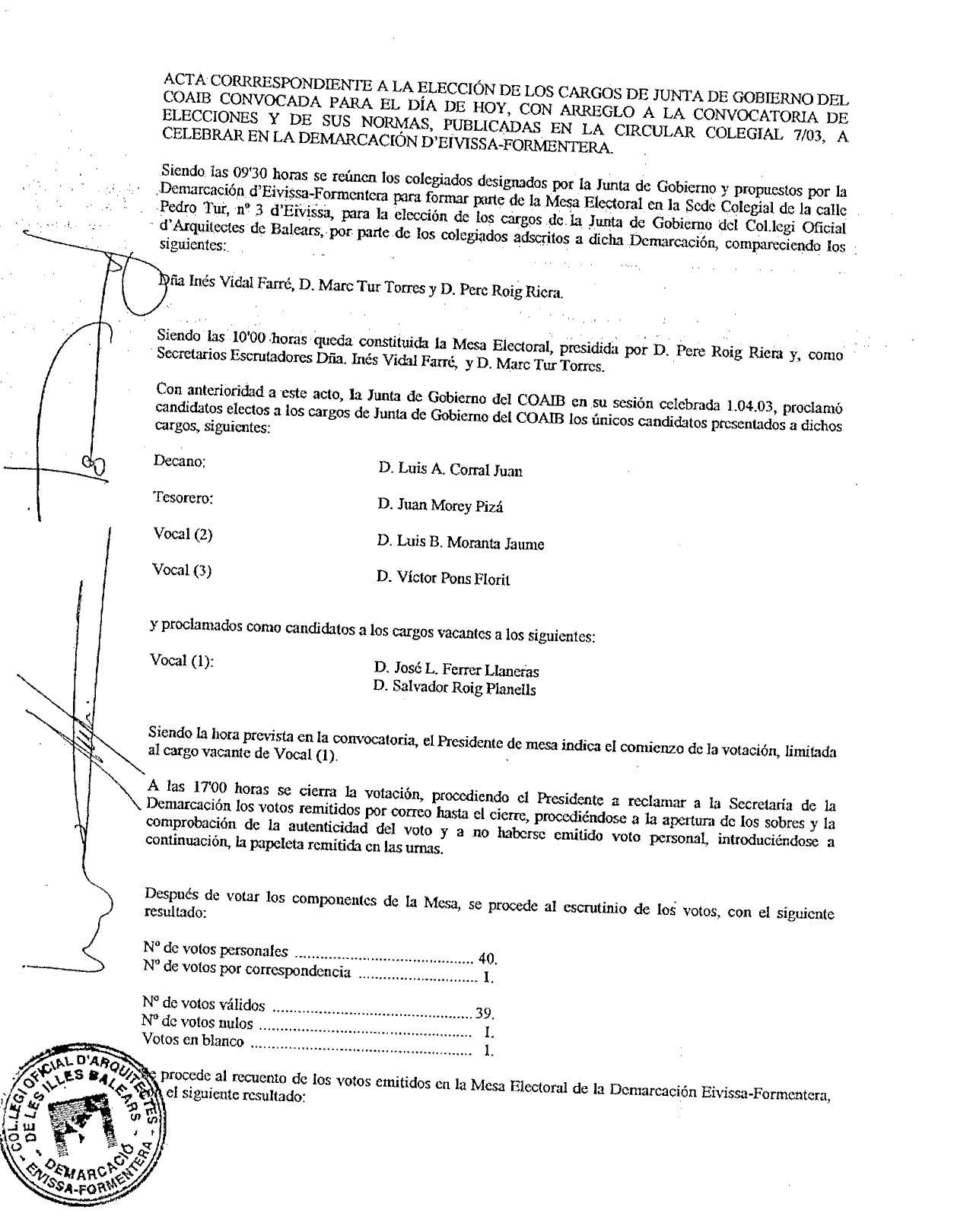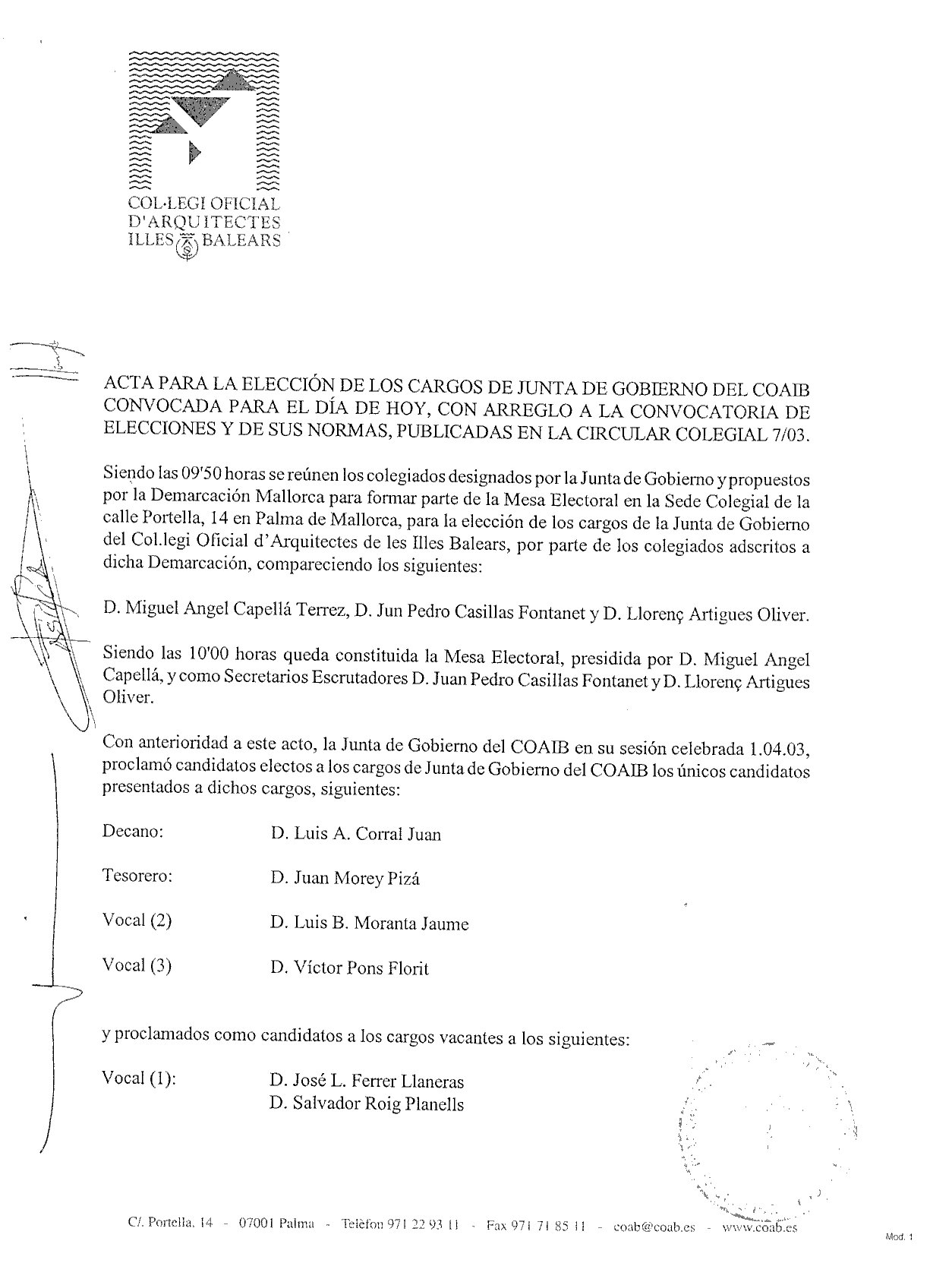 Después de las Elecciones celebradas el pasado 21 de mayo de 2003, las Juntas de Gobierno del Col·legi y las Demarcaciones, han quedado constituidas según consta en el anexo que se adjunta.