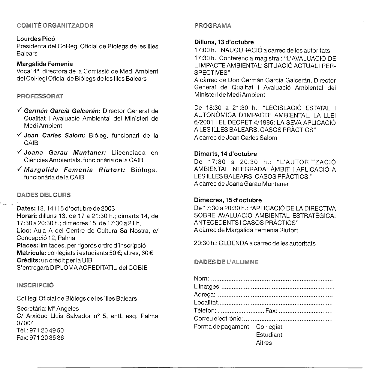 El Col·legi Oficial de Biólegs de les Illes Balears organiza la II Jornada de Medio Ambiente, bajo el título: "La nueva legislación ambiental: Ley 6/2001 de evaluación de impacto ambiental. Ley 16/2002 de prevención y control integrado de la contaminación y la directiva 2001/42/CE sobre evaluación ambiental estratégica, que se impartirá del 13 al 15 de octubre de 2003.