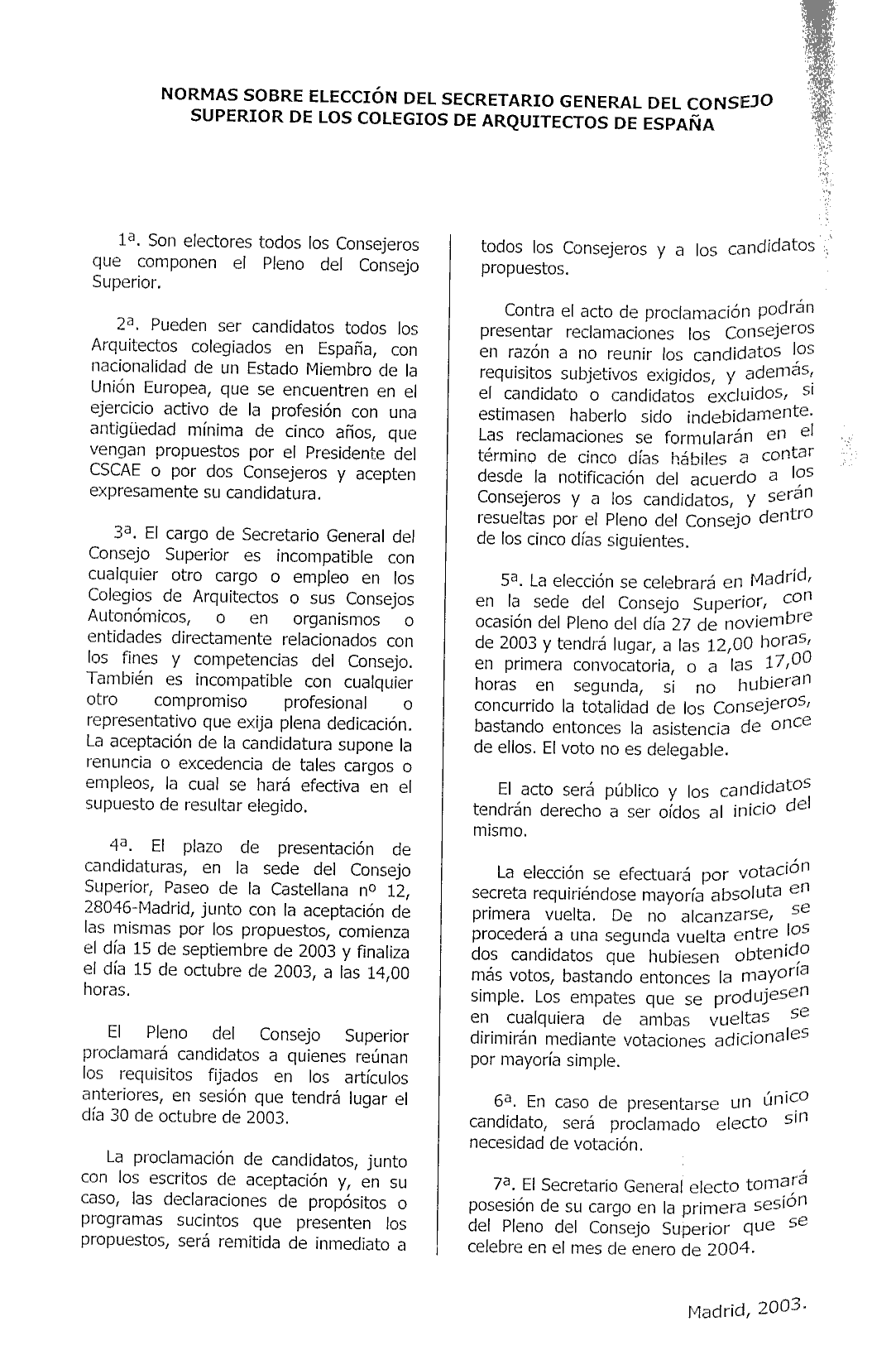 - Plazo presentación de candidatos: del 15 de septiembre al 15 de octubre de 2003, a las 14 horas, en el sede del Consejo Superior , Paseo de la Castellana, 12 - 28046 Madrid