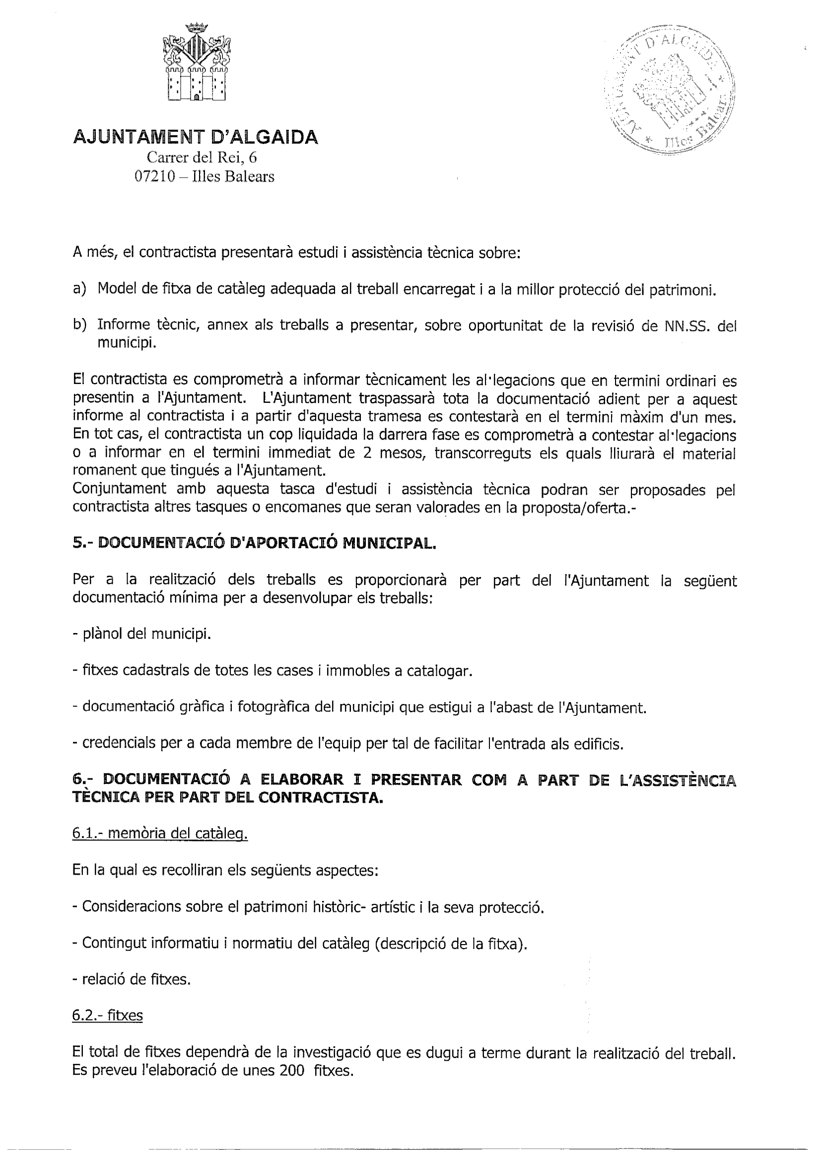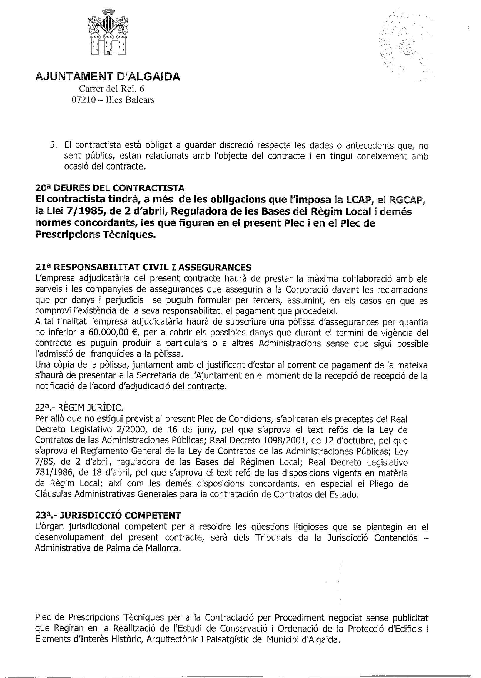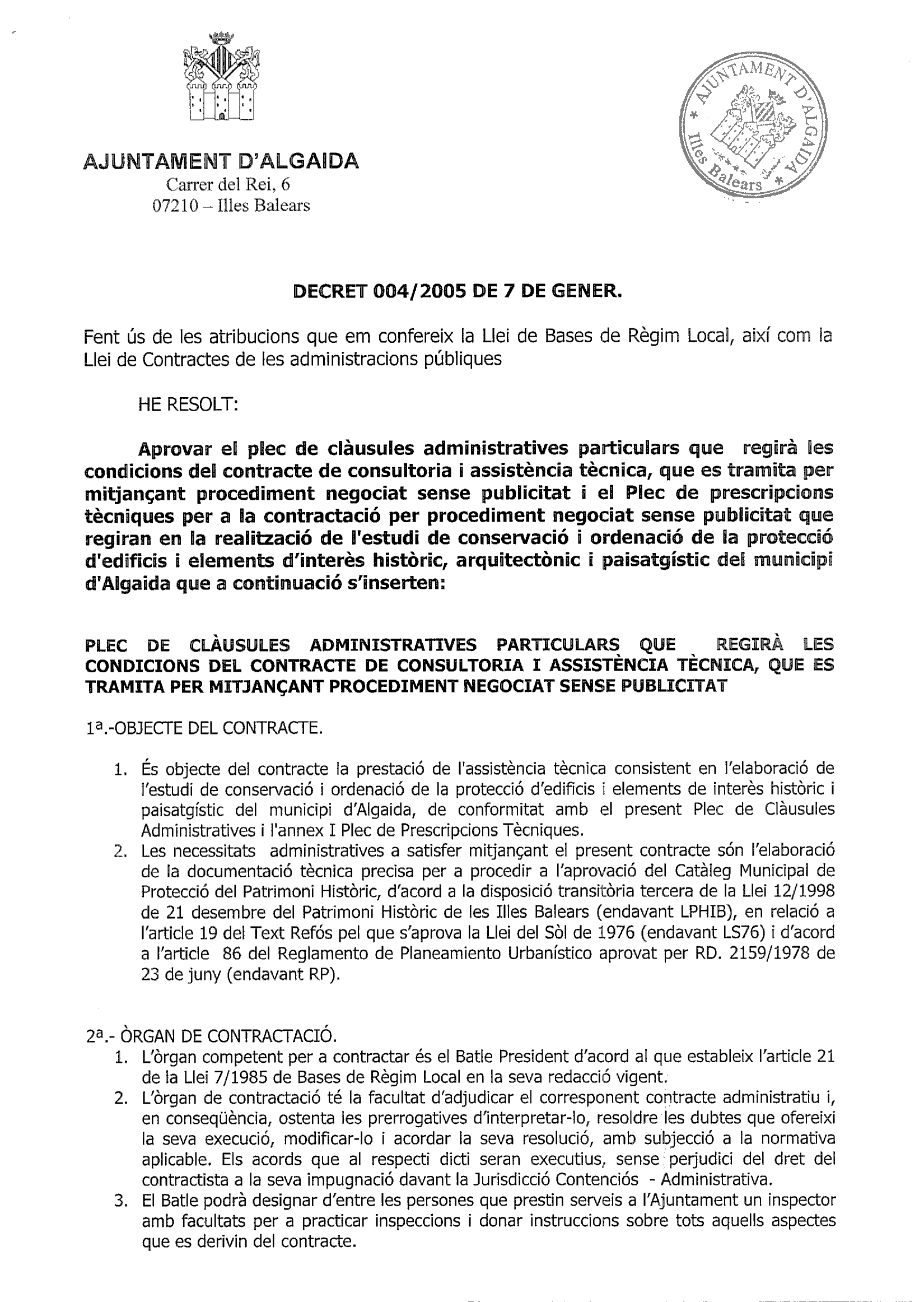 El Ayuntamiento de Algaida solicita, mediante escrito de fecha 14.01.05 (Reg.Entrada Demarcación Mallorca nº 22 de 19.01.05) la difusión de la aprobación del pliego de cláusulas administrativas particulares que deben regir las condiciones del contrato de consultoría y asistencia técnica mediante procedimiento negociado sin publicidad y el pliego de prescripciones técnicas a efectos de realizar el estudio de conservación y ordenación de la protección de edificios y elementos de interés histórico, arquitectónico y paisajístico del municipio de Algaida.