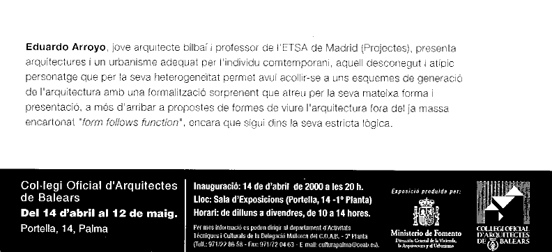 La Delegación Mallorca del C.O.A.B. y el Ministerio de Fomento, organizan una exposición bajo el título "Eduardo Arroyo", presentando la obra del joven arquitecto bilbaíno, recogiendo proyectos tan fascinantes como una guarderia en Sondika o el Auditorio de Pamplona.