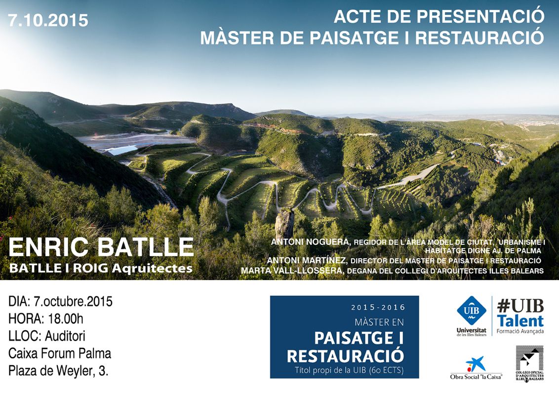 La Universitat de les Illes Balears, en colaboración con el Col·legi Oficial d’Arquitectes de les Illes Balears, realizará una jornada de presentación del Máster en Paisaje y Restauración, con la intervención del Sr. Enric Batlle, de Batlle i Roig Arquitectes, donde se informará a todos los interesados sobre los objetivos y demás características del Máster, y que tendrá lugar el 7 de octubre de 2015, a las 18:00 horas, en el Auditorio del CaixaForum Palma (Plaza Weyler, 3 – Palma).