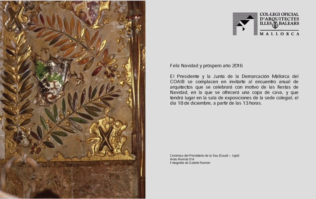 El presidente y la Junta de la Demarcación Mallorca del COAIB se complacen en invitarte al encuentro anual de arquitectos que se celebra con motivo de las fiestas de Navidad, en el que se ofrecerá una copa de cava, y que tendrá lugar en la sala de exposiciones de la sede colegial, el viernes día 18 de diciembre, a partir de las 13:00 horas.