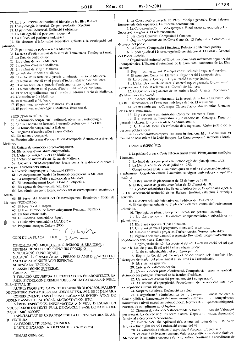 El BOE nº 218 de data 11.09.01 publica Resolució de 14 d'agost del Consell Insular de Mallorca (Illes Balears), referent a la convocatòria per a proveir, entre altres, dues places d'arquitecte superior.