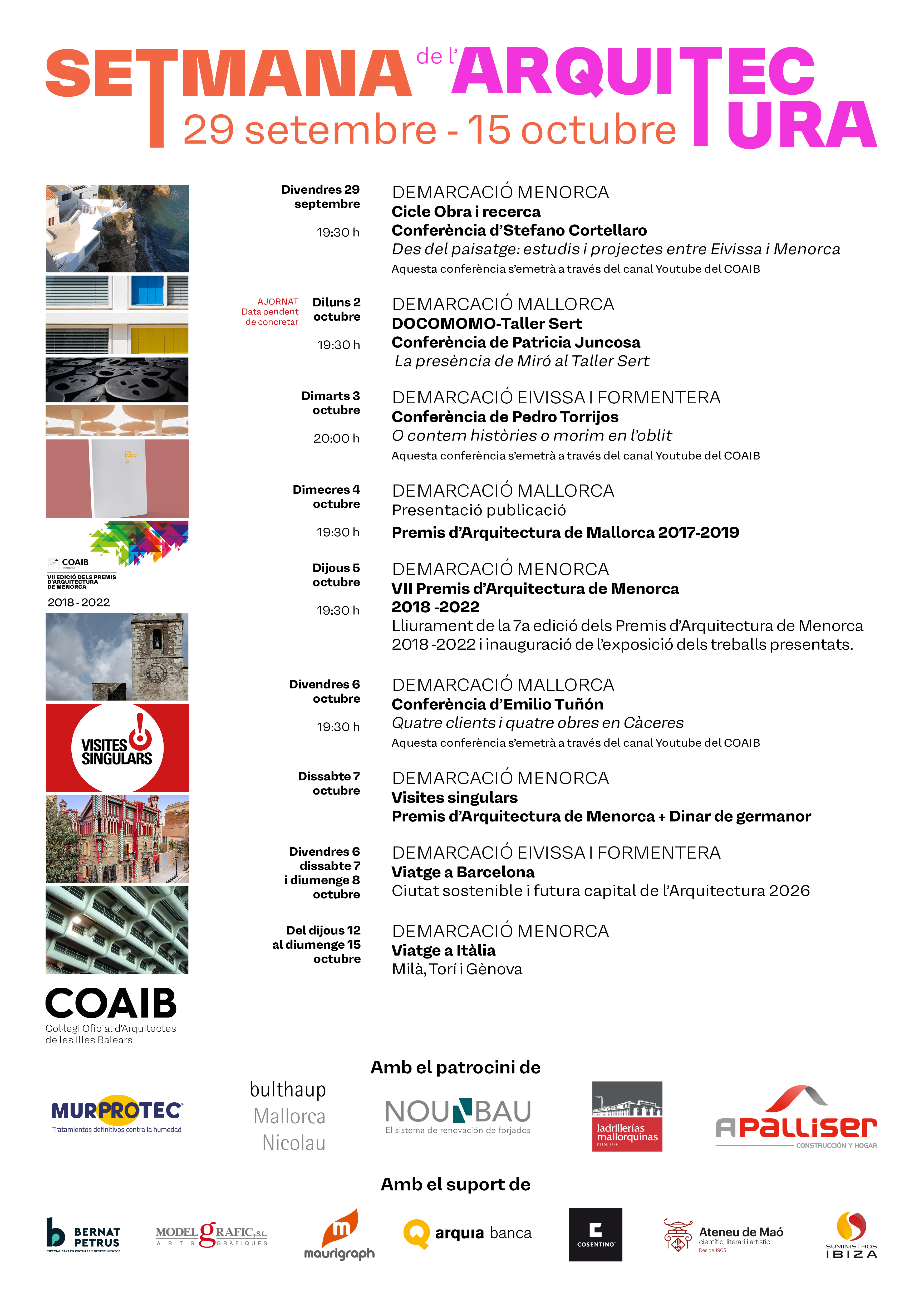 Enguany us oferim un programa molt variat que es desenvoluparà del 29 de setembre al 15 d'octubre, en les tres demarcacions del COAIB: Eivissa i Formentera, Mallorca i Menorca, i que inclou conferències com la de l'arquitecte Emilio Tuñón, Premi Nacional d'Arquitectura 2022; la de Pedro Torrijos, arquitecte i crític cultural, gran comunicador i divulgador de l'arquitectura; o la de l'arquitecte Stefano Cortellaro que inaugura el Cicle "Obra i Recerca", entre moltes altres activitats.