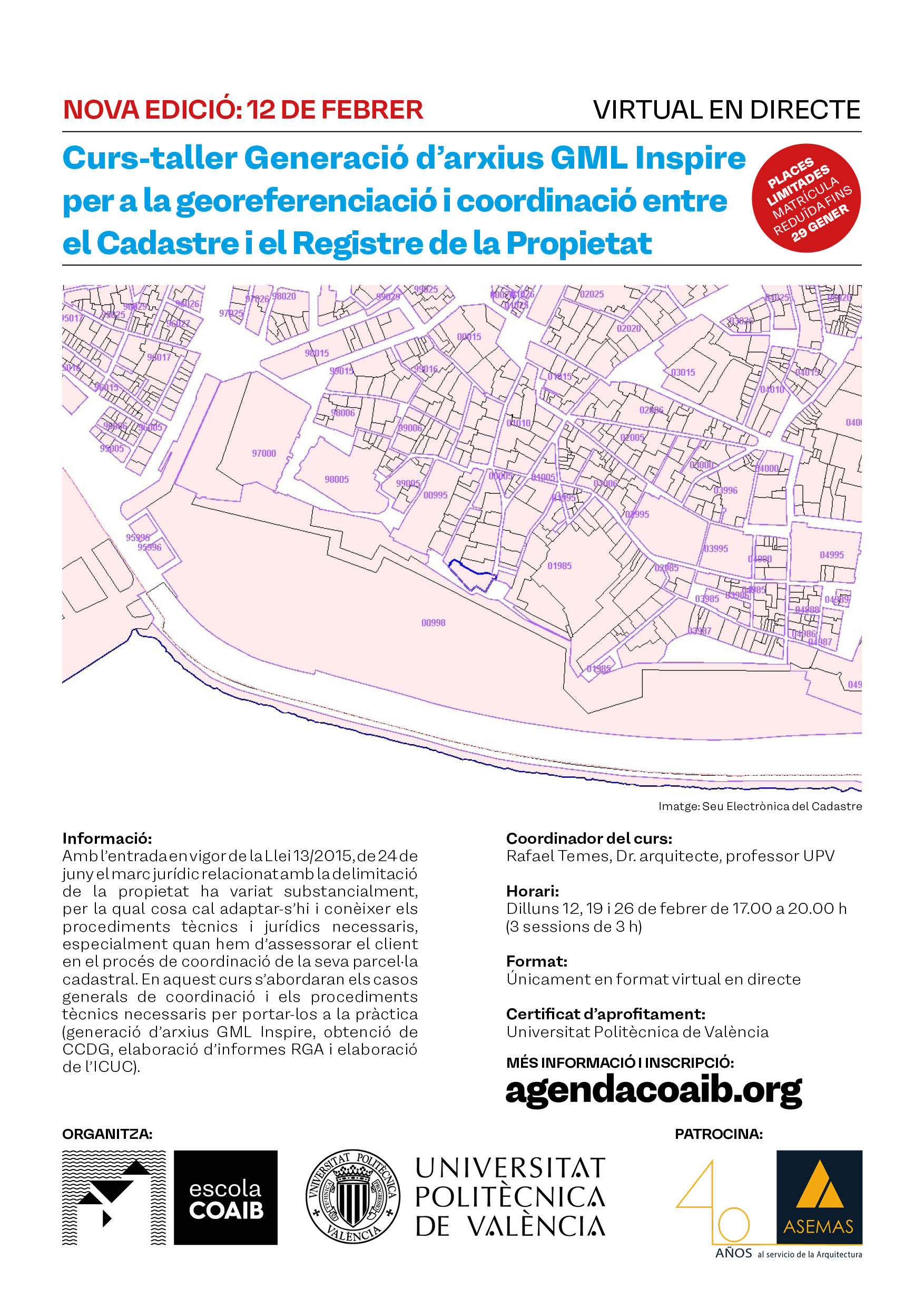 Us informem que hem obert el període d'inscripció d'una nova edició del Curs-taller Generació d’arxius GML Inspire per a la georeferenciació i coordinació entre el Cadastre i el Registre de la Propietat, coorganitzat per l'Escola COAIB i la Universitat Politècnica de València (UPV), i patrocinat per Asemas, que s'impartirà els dilluns 12, 19 i 26 de febrer de 17.00 a 20.00 h en format virtual en directe.