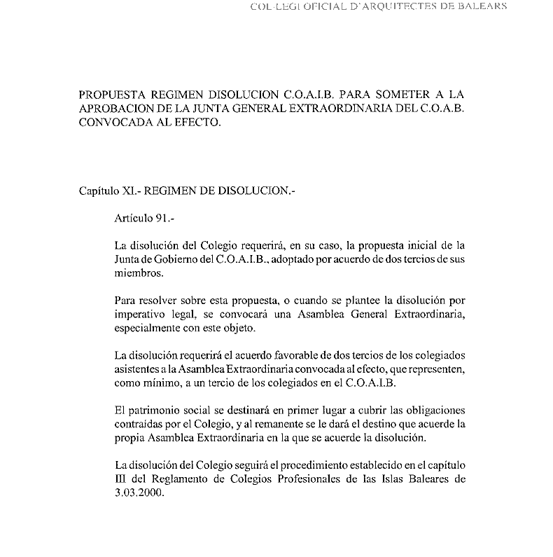 Convocatòria Junta General Extraordinària per a aprovació del Règim de Dissolució del COAIB, i la seva inclusió dels Estatus ja aprovats a la Junta General Extraordinària de data 13 de març de 2001.