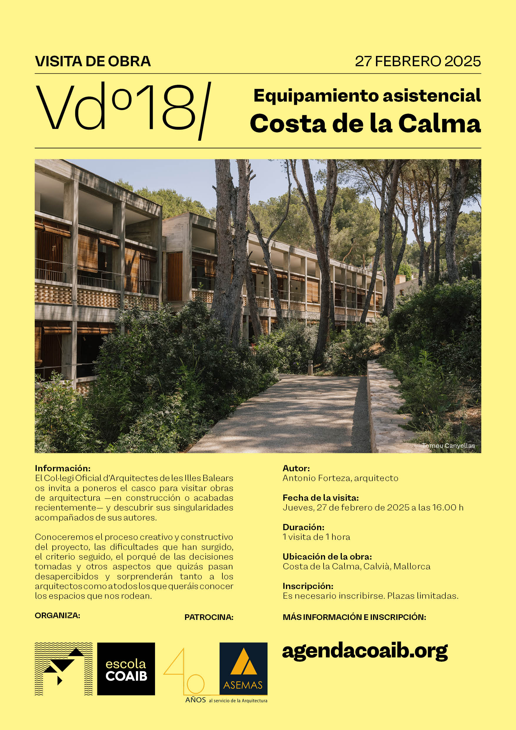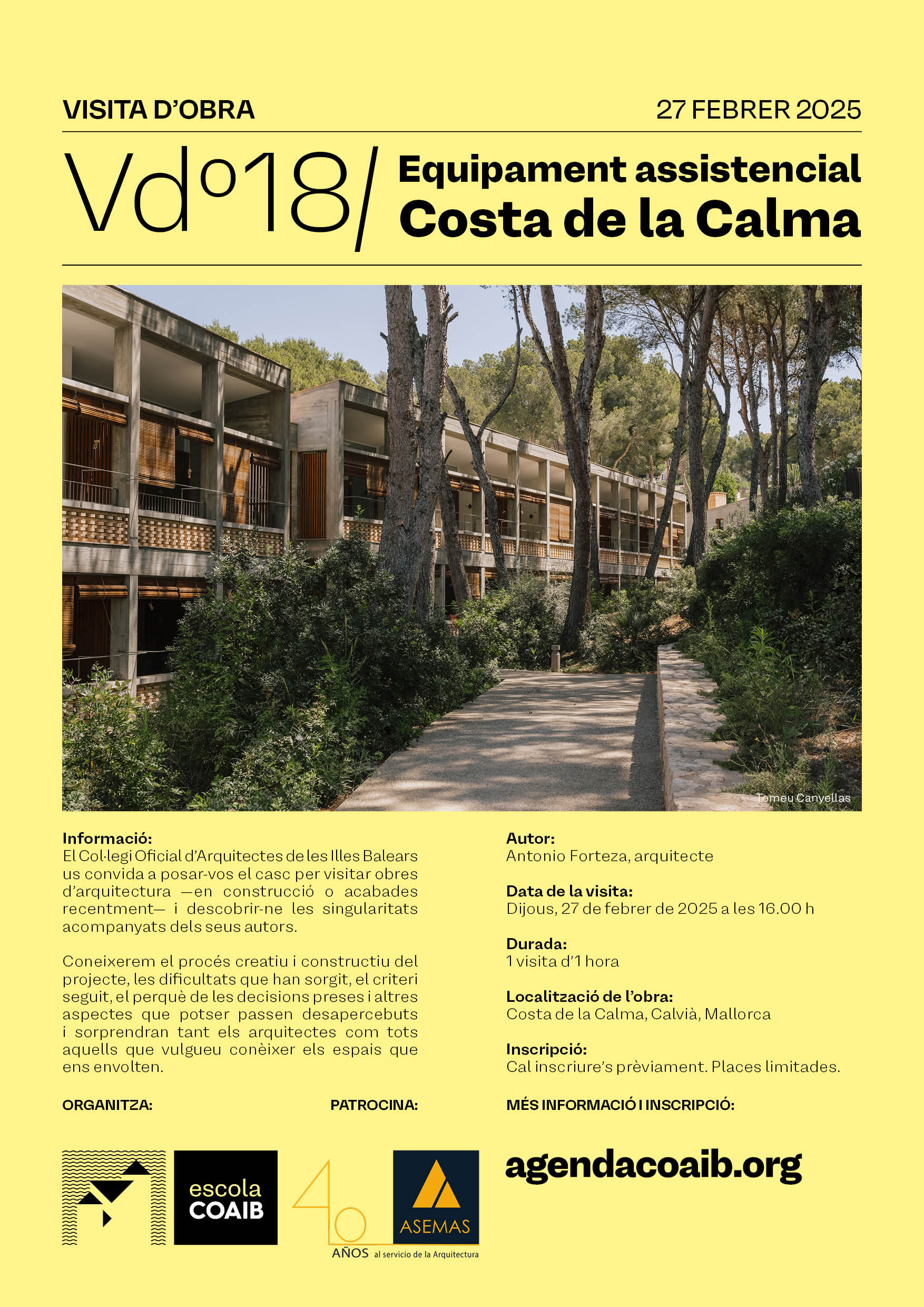 En aquesta ocasió coneixerem el procés creatiu i constructiu d'aquest equipament assistencial a la Costa de la Calma, obra de l'arquitecte Antonio Forteza, amb qui descobrirem les dificultats que han sorgit, el criteri seguit, el perquè de les decisions preses i altres aspectes que potser passen desapercebuts i sorprendran tant els arquitectes com tots aquells que vulgueu conèixer els espais que ens envolten.