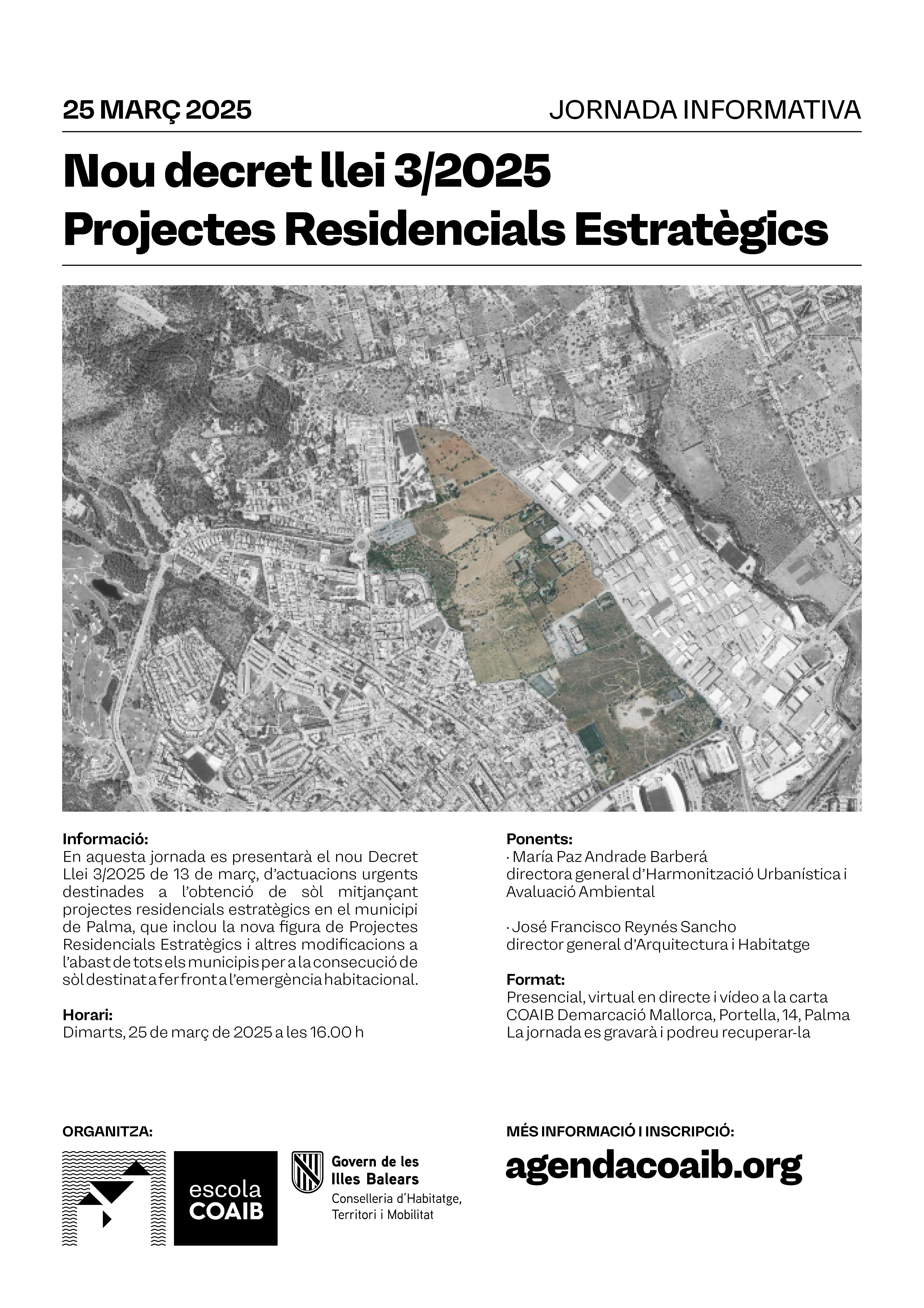 En aquesta jornada es presentarà el nou Decret Llei 3/2025 de 13 de març, d’actuacions urgents destinades a l’obtenció de sòl mitjançant projectes residencials estratègics en el municipi de Palma, que inclou la nova figura de Projectes Residencials Estratègics i altres modificacions a l’abast de tots els municipis per a la consecució de sòl destinat a fer front a l’emergència habitacional.