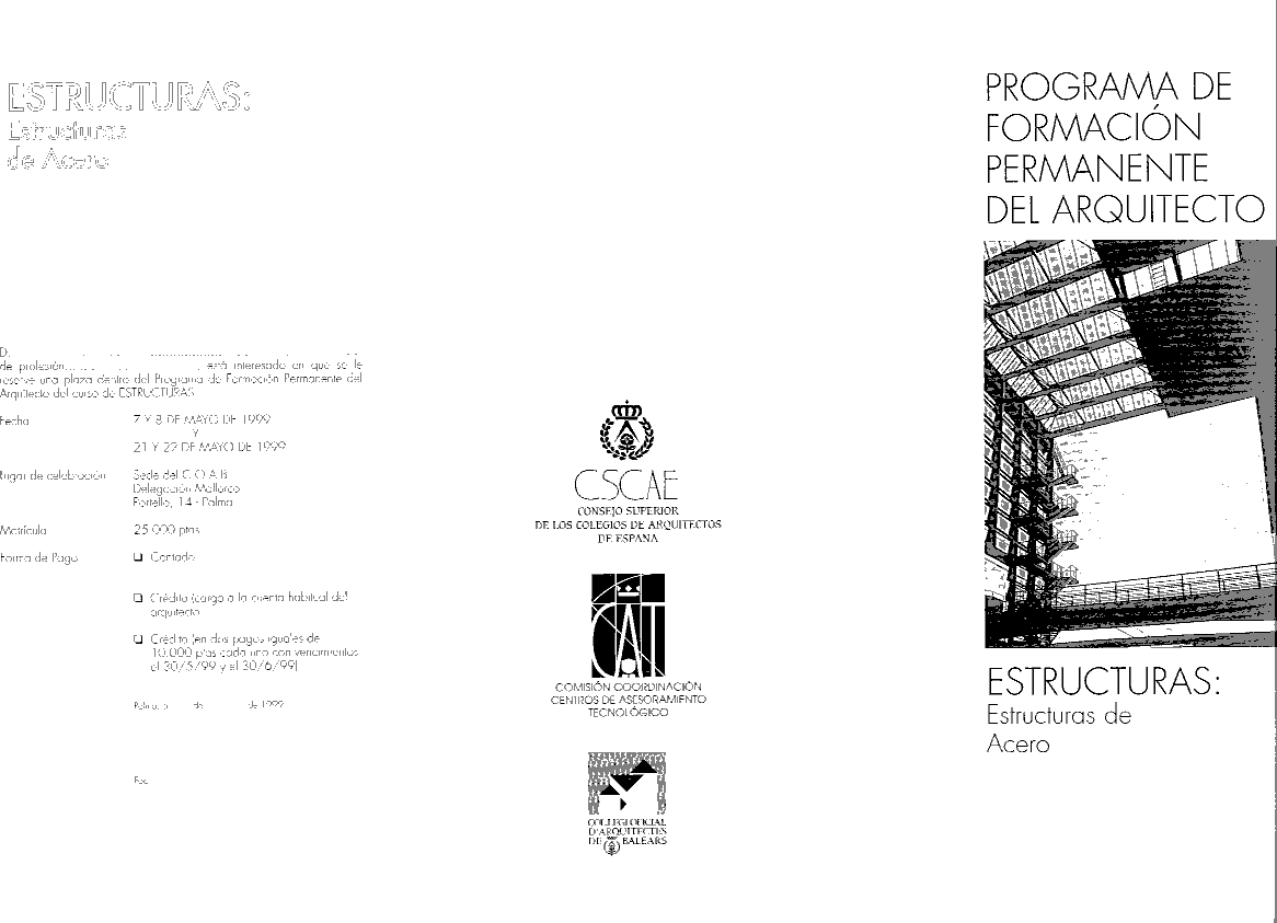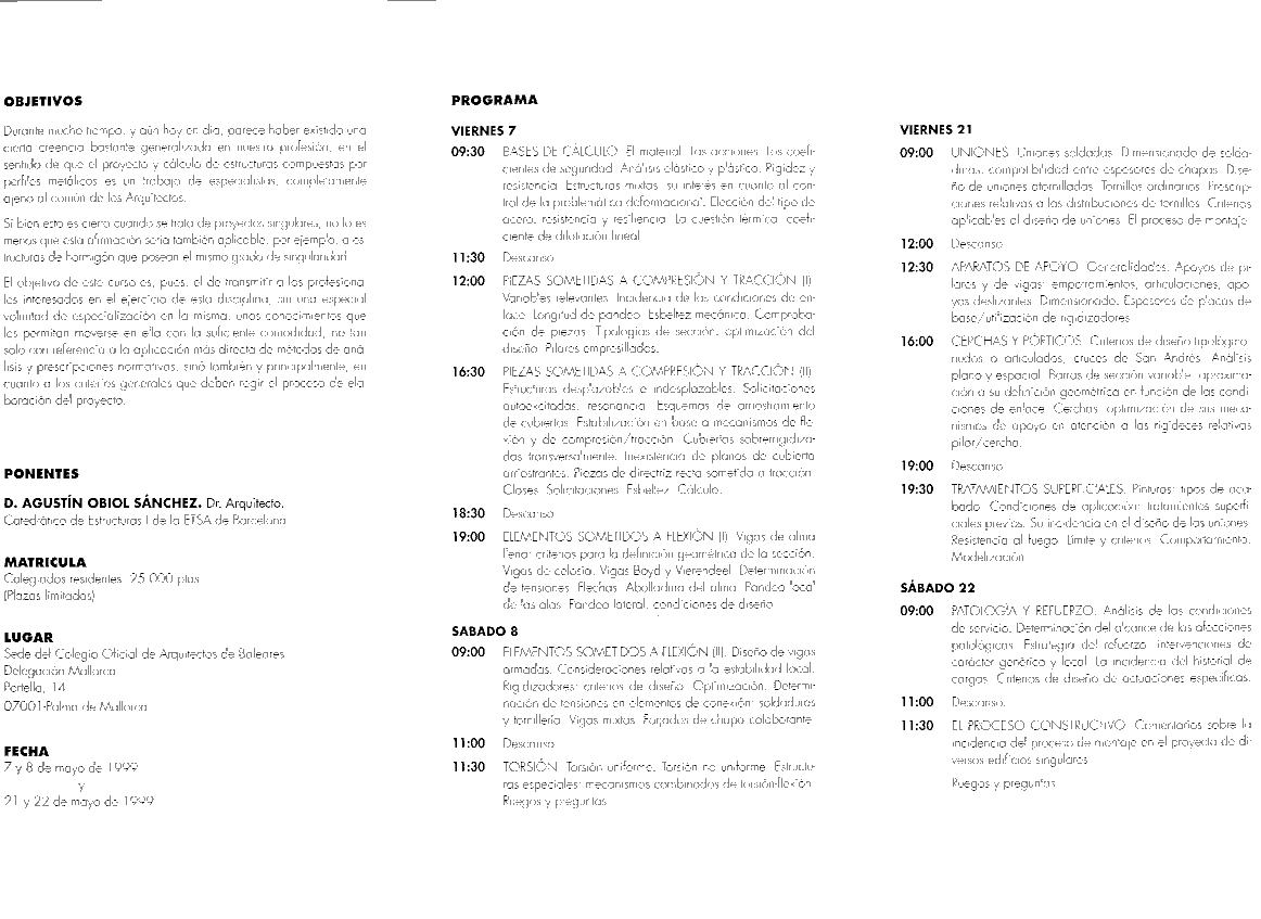 Com a continuació del programa iniciat l'any passat, dins la Formació Permanent de l'Arquitecte, dedicat a l'àrea d'Estructures, es comunica que els dies 7-8 i 21-22 de maig de 1999 es celebrarà un curs sobre Estructures d'Acer, que tindrà lloc a la Sala de Conferències de la Delegació Mallorca del C.O.A.B., i que impartirà l'Arquitecte D. Agustín Obiol Sánchez, Catedràtic d'Estructures I de l'Escola Tècnica Superior d'Arquitectura de Barcelona.