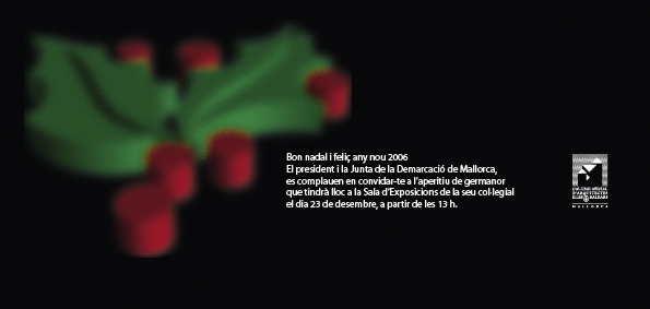 El president i la Junta de la Demarcació Mallorca es complauen en convidar-lo a l'aperitiu de Nadal, que se celebrarà el pròxim divendres, 23 de Desembre de 2005, a partir de les 13 hores, a la Sala d'Exposicions del COAIB (Portella, 14 - 1º Planta).