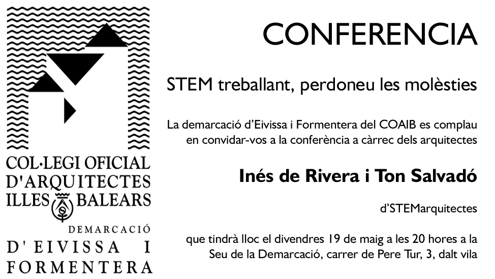La Demarcació d'Eivisssa-Formentera del *COAIB organitza la conferència "STEM treballant, perdoneu les molèsties" a càrrec dels arquitectes Inés de Rivera i Ton Salvadó (STEMarquitectes), en la qual presentaran el treball de STEM realitzat en els últims anys.