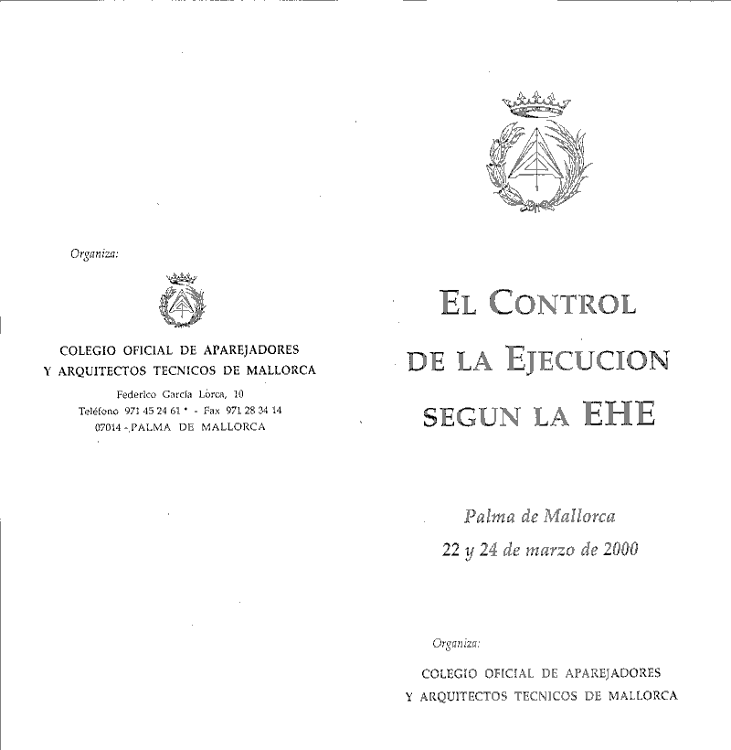 El Colegio Oficial de Aparejadores y Arquitectos Técnicos de Mallorca (COAATM) ha organitzat un curs sobre "El Control de l' Execució segons la EHE", el qual es celebrarà els dies 22 i 24 de març de 2000.
