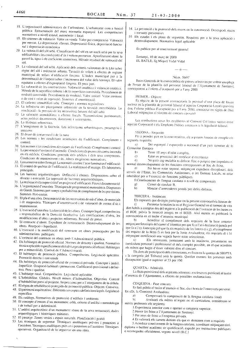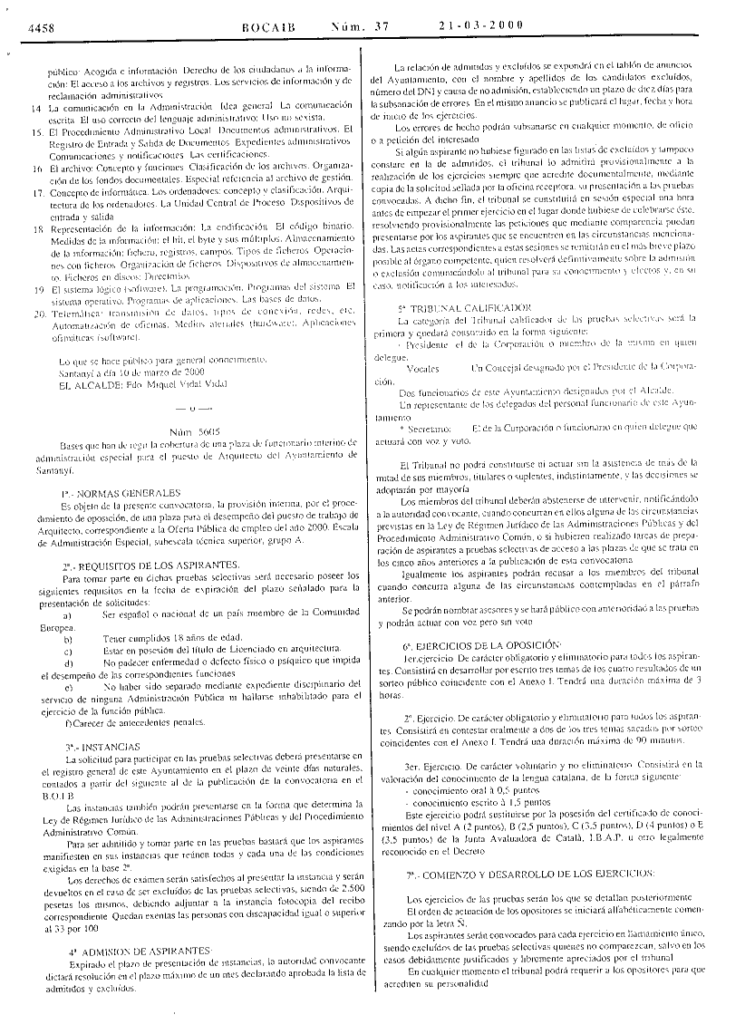 El BOCAIB n º 37 de 21.03.00 publica las Bases que han de regir la cobertura d'una plaça de funcionari interí d'administració especial pel lloc d'arquitecte de l'Ajuntament de Santanyí.