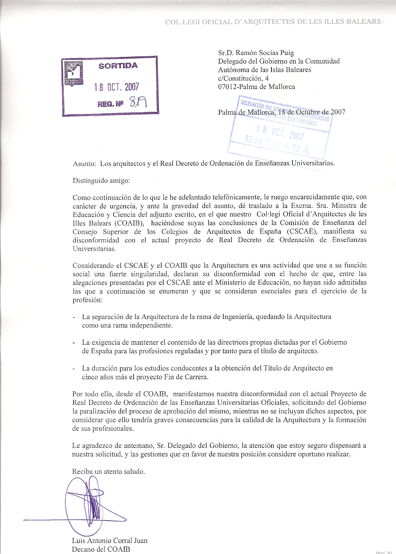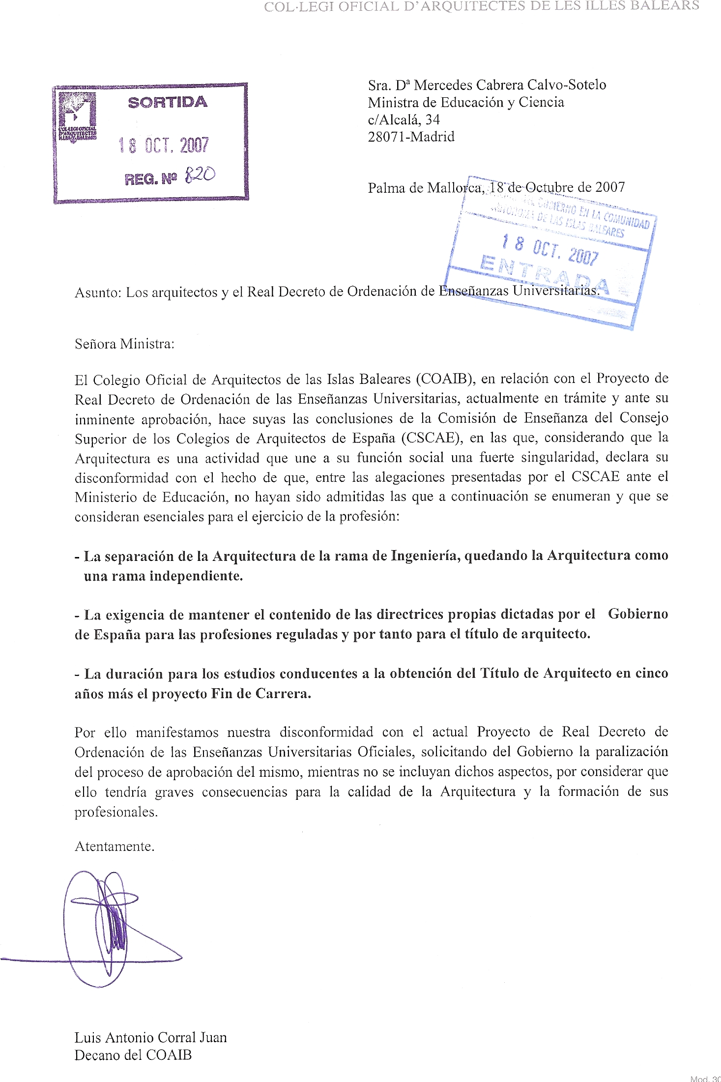 En mi anterior carta te indicaba que se había dado un plazo (1) hasta el martes 16 para que los distintos Colegios de Arquitectos se definieran avalando las conclusiones (2) de la Comisión de Enseñanza del Consejo Superior de los Colegios de Arquitectos de España sobre los tres puntos que desde el Pleno del Consejo Superior habíamos considerado fundamentales demandar del Gobierno de entre los que no se habían admitido mediante las alegaciones que habíamos presentado, antes del verano, al Proyecto de Real Decreto de Ordenación de las Enseñanzas Universitarias Oficiales.