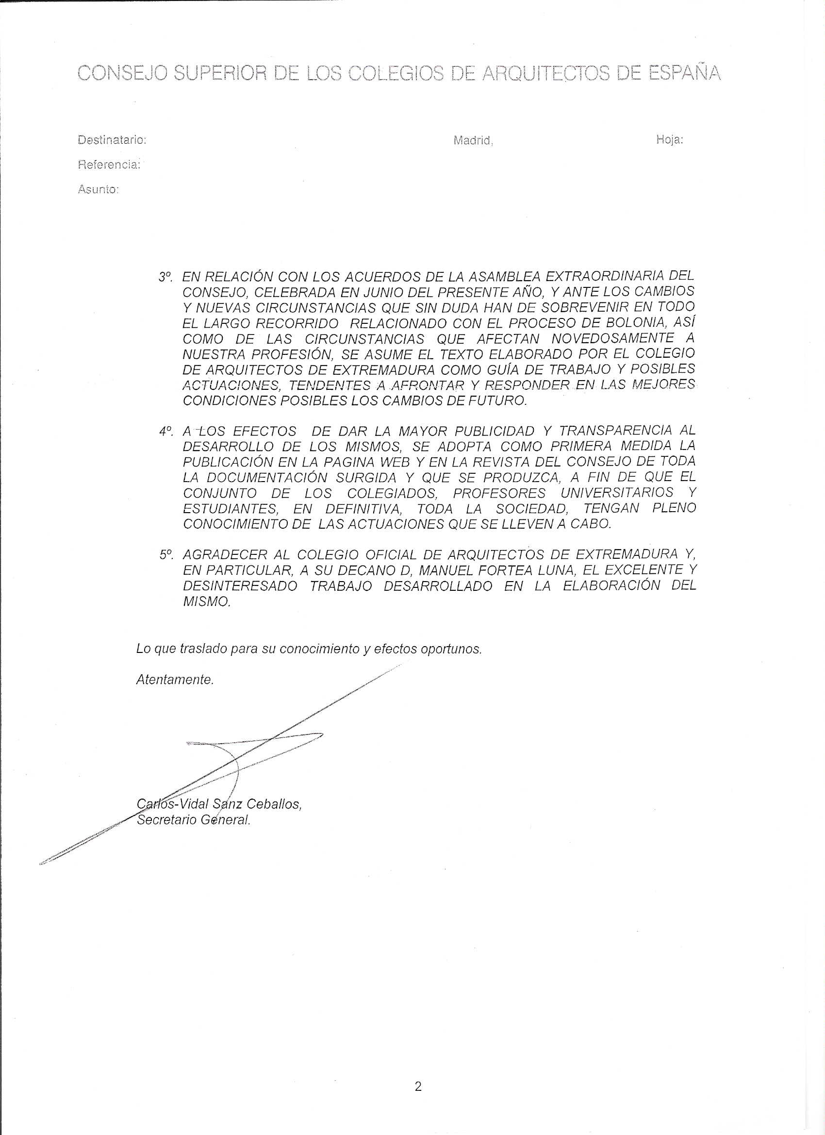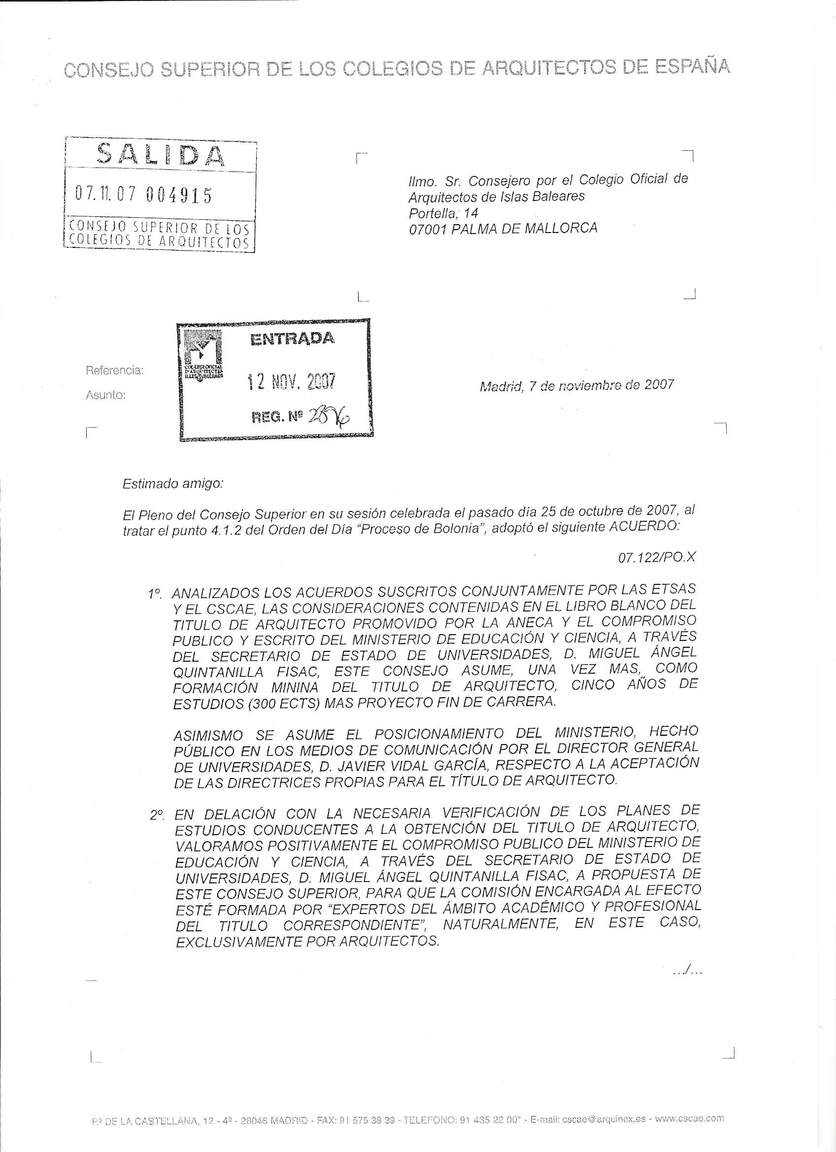 Com continuació de la Carta Degà del passat mes d'octubre,s'adjunta acord adoptat pel Consell Superior dels Col·legis d'Arquitectes d'Espanya, relatiu al Procés de Bolonya.
