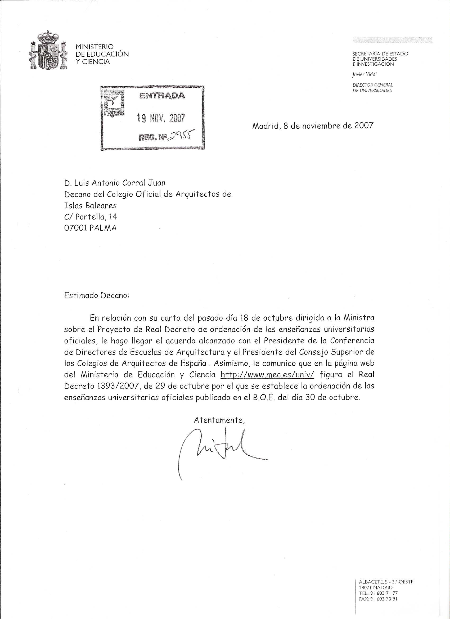 Així mateix, s'adjunta carta del Director General d'Universitats en resposta a la carta remesa pel degà, a través del Delegat de Govern a Balears, a la Ministra d'Educació.