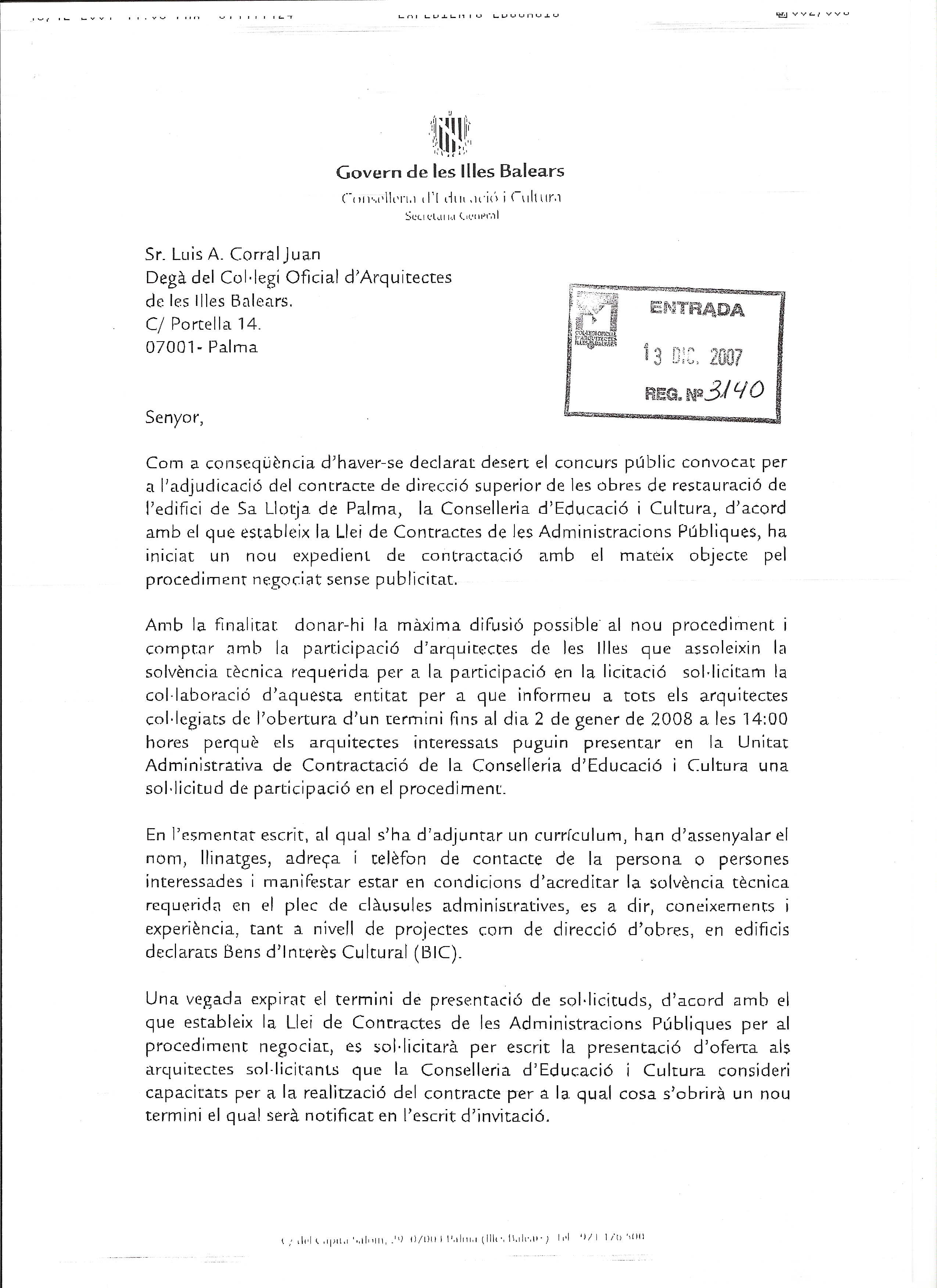 Com recordatori i per a major difusió de la notícia publicada en la primera plana de www.coaib.es, el passat 13 de desembre, es reprodueïx la convocatòria efectuada per la Conselleria d'Educació i Cultura del Govern de les Illes Balears per a l'adjudicació del contracte de direcció de les obres de restauració de l'edifici de Sa Llotja de Palma.