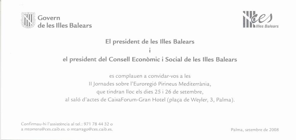 El CES, Consell Econòmic i Social de les Illes Balears organitza les II Jornades sobre l'Euroregió Pirineus Mediterrània, que se celebraran els dies 25 i 26 de setembre de 2008 a Palma.