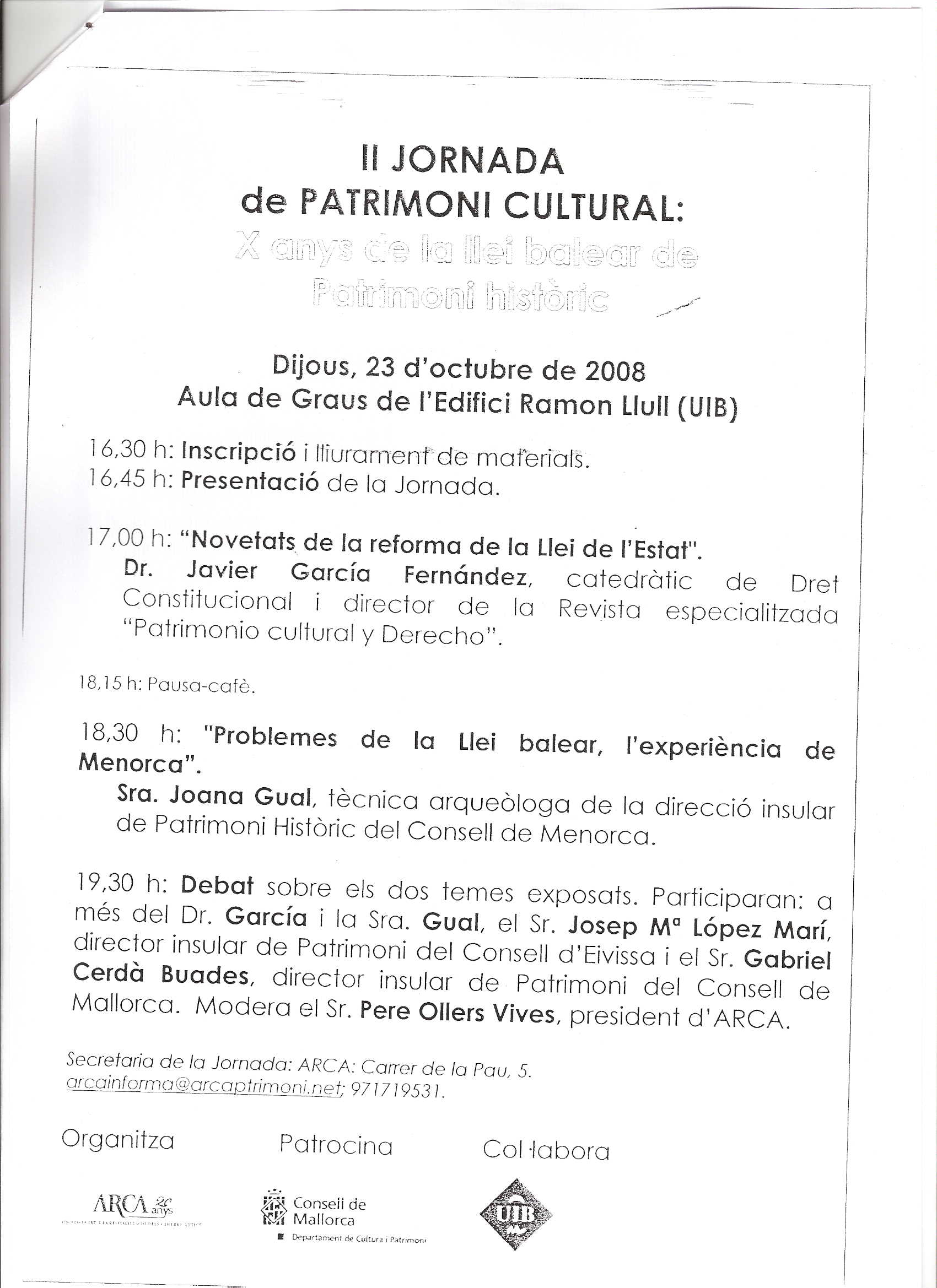 Organitzada per ARCA, amb la col·laboració de la UIB i el patrocini del Consell de Mallorca, se celebrarà avui Dijous, 23 d'octubre de 2008, a partir de les 16.30 h., en l'Aula de Graus de l'Edifici Ramon Llull (Campus Universitari, UIB).