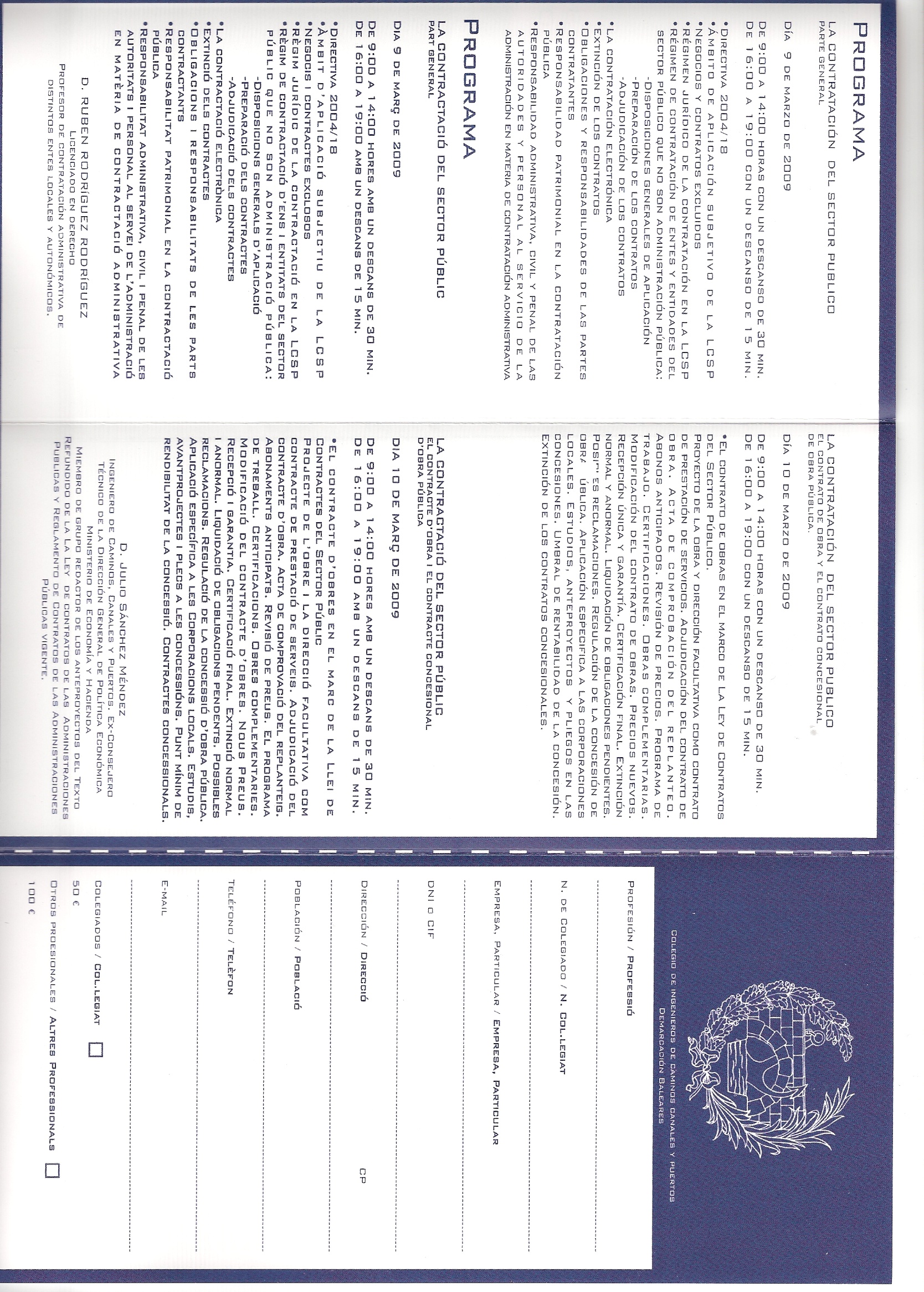 El Col·legi d'Enginyers de Camins, Canales i Ports, Demarcació Balears, organitza unes jornades sobre "La Llei de contractes del sector públic", que se celebraran els dies 9 i 10 de març de 2009, en la sala d'Actes de l'Il·lustre Col·legi d'Advocats de Balears (Rambla dels Ducs de Palma, 10).