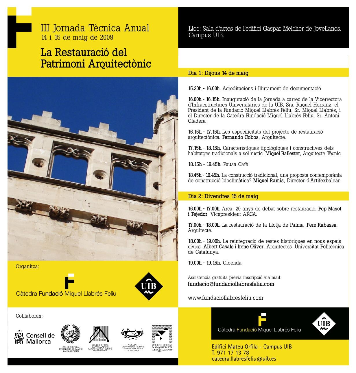 La Fundació Miquel Llabrés Feliu organitza una jornada sobre Restauració del Patrimoni Arquitectònic, amb la col·laboració del COAIB entre altres entitats, i que se celebrarà els dies 14 i 15 de maig en la sala d'actes de l'Edifici Gaspar Melchor de Jovellanos, en el campus de la Universitat de les Illes Balears (UIB). S'adjunta programa en annex.