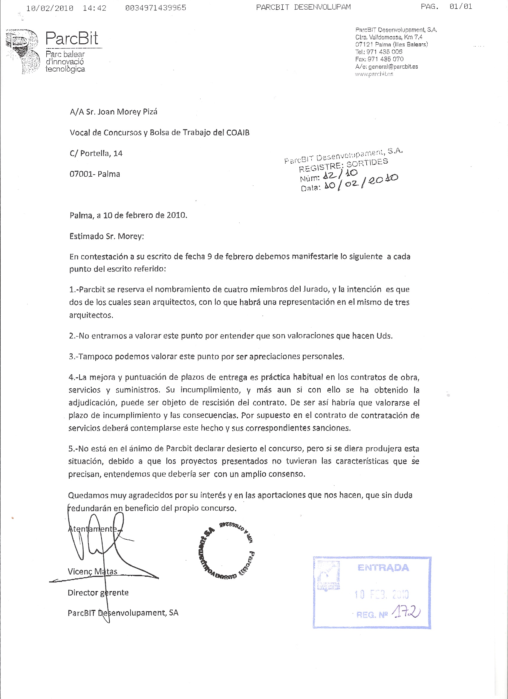 Resposta de Parc Bit Desenvolupament S.A, a l'escrit d'observacions presentat pel COAIB en relació al "Concurs per al projecte de construcció de l'edifici del Centre Bit Menorca".