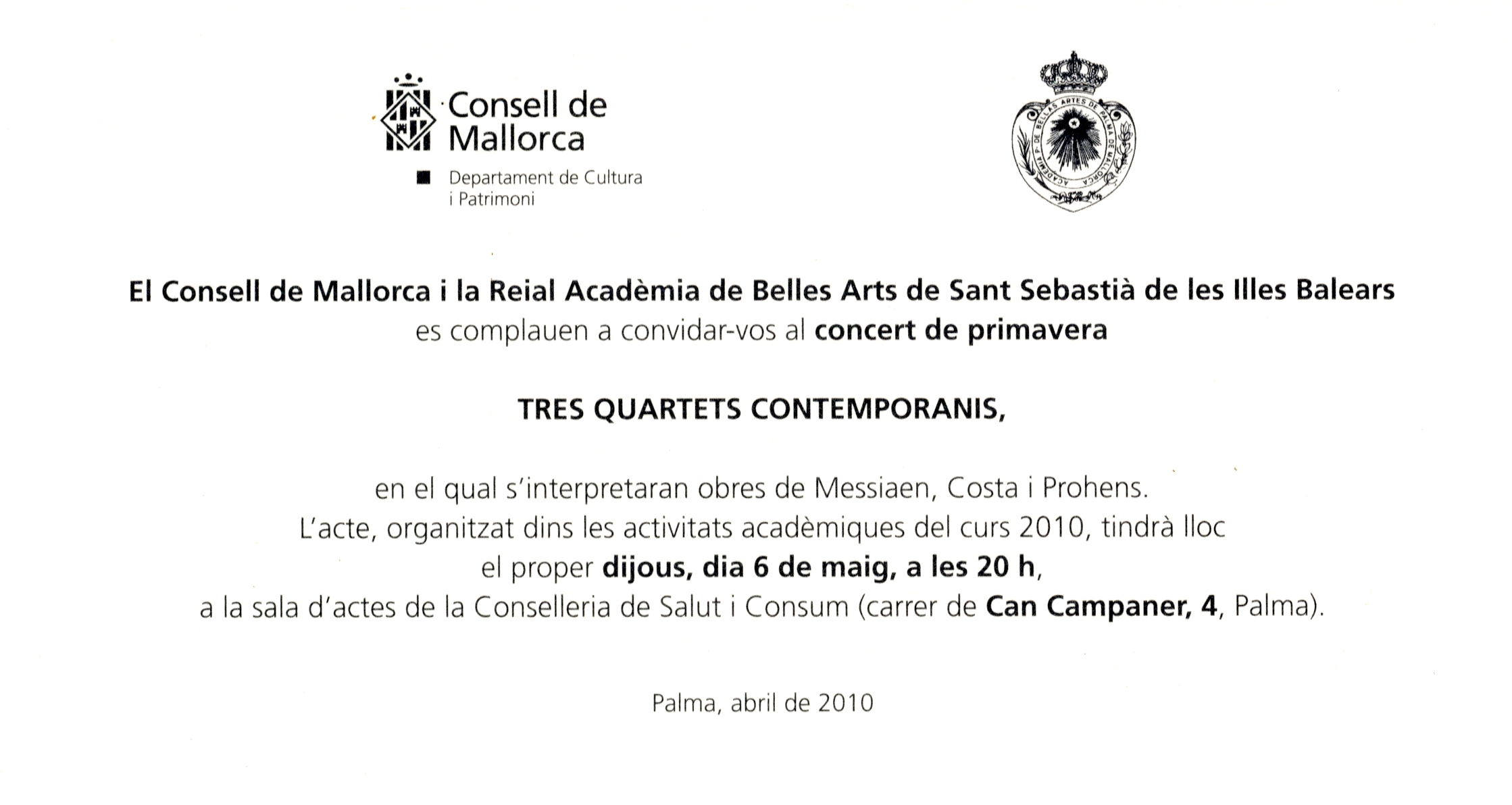 El Consell de Mallorca i la Real Acadèmia de Belles Arts de Sant Sebastià de les Illes Balears es complauen en convidar-los en el concert de primavera "Tres quartets contemporanis" en el qual s'interpretaran les obres de Messiaen, Costa i Prohens.