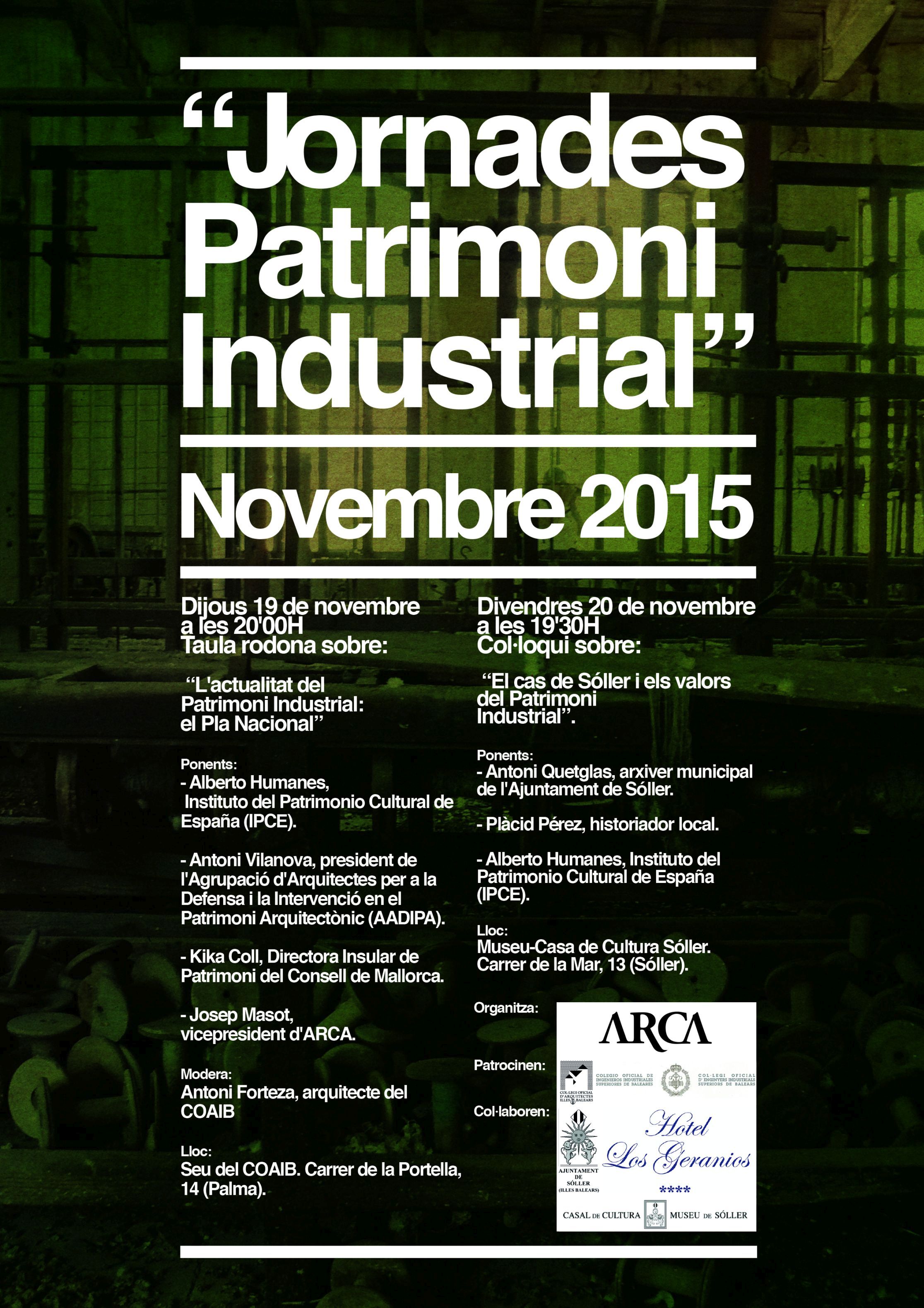L'Associació per a la Revitalització dels Centres Àntics, ARCA, organitza amb el patrocini del COAIB i el Col·legi Oficial d'Enginyers Industrials Superiors de Balears, unes Jornades sobre patrimoni industrial que se celebraran els dies 19 i 20 de novembre, d'acord amb el següent programa:
