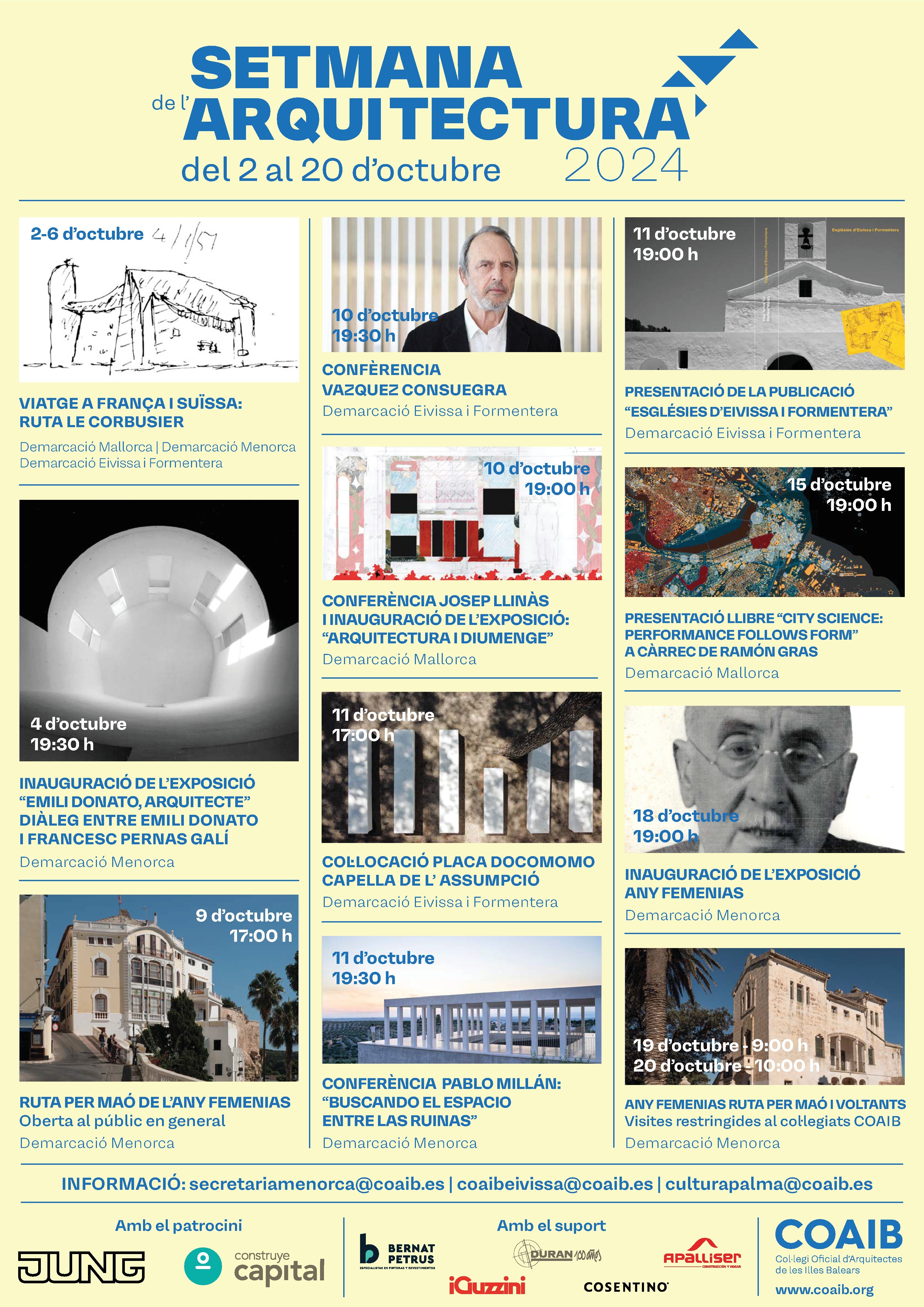 • 10 d’octubre, 19:00 h: conferència de Josep Llinàs i inauguració de l’exposició “Arquitectura i diumenge”, a la sala d'actes i exposicions de la Demarcació Mallorca del COAIB.