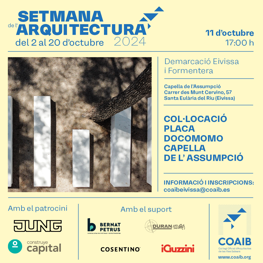 - Col·locació de la placa Docomomo: 11 d’octubre, 17:00 h, a la Capella de l’Assumpció, Santa Eulària del Riu.