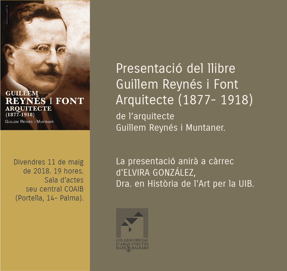 El COAIB organiza el acto de presentación del libro Guillem Reynés y Font. Arquitecto (1877-1918), cuyo autor es el arquitecto Guillem Reynés Muntaner, que tendrá lugar el viernes 11 de mayo, a las 19:00 horas, en el salón de actos de la sede central del COAIB (calle Portella, 14 – Palma) y que se transmitirá por videoconferencia a las demarcaciones de Ibiza y Formentera y de Menorca del COAIB.