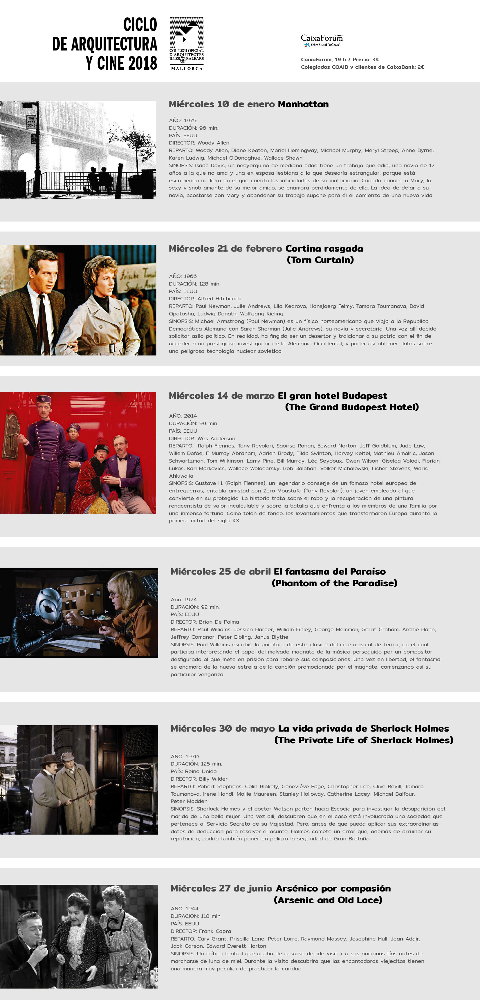 Manhattan, de Woody Allen, proyectada el pasado 10 de enero; Cortina rasgada, de Alfred Hitchcock, el 21 de febrero; El gran hotel Budapest, de Wes Anderson, el 14 de marzo; El fantasma del Paraíso, de Brian de Palma, el 25 de abril; La vida privada de Sherlock Holmes, de Billy Wilder, el 30 de mayo y Arsénico por compasión, de Frank Capra, el 27 de junio.
