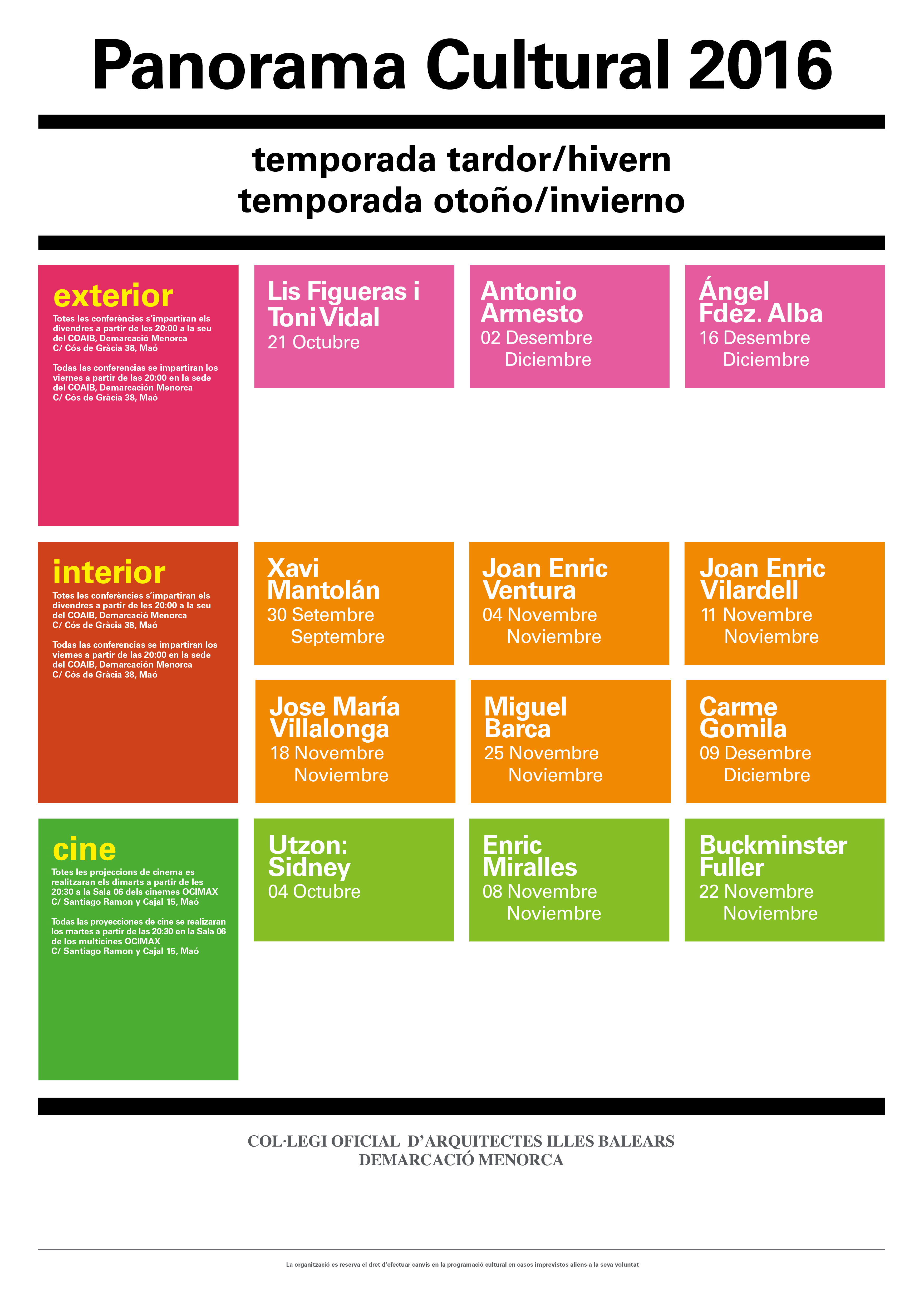 La Vocalía de Cultura de la Demarcación de Menorca del COAIB presenta el programa actualizado de las actividades culturales previstas para la temporada otoño-invierno.