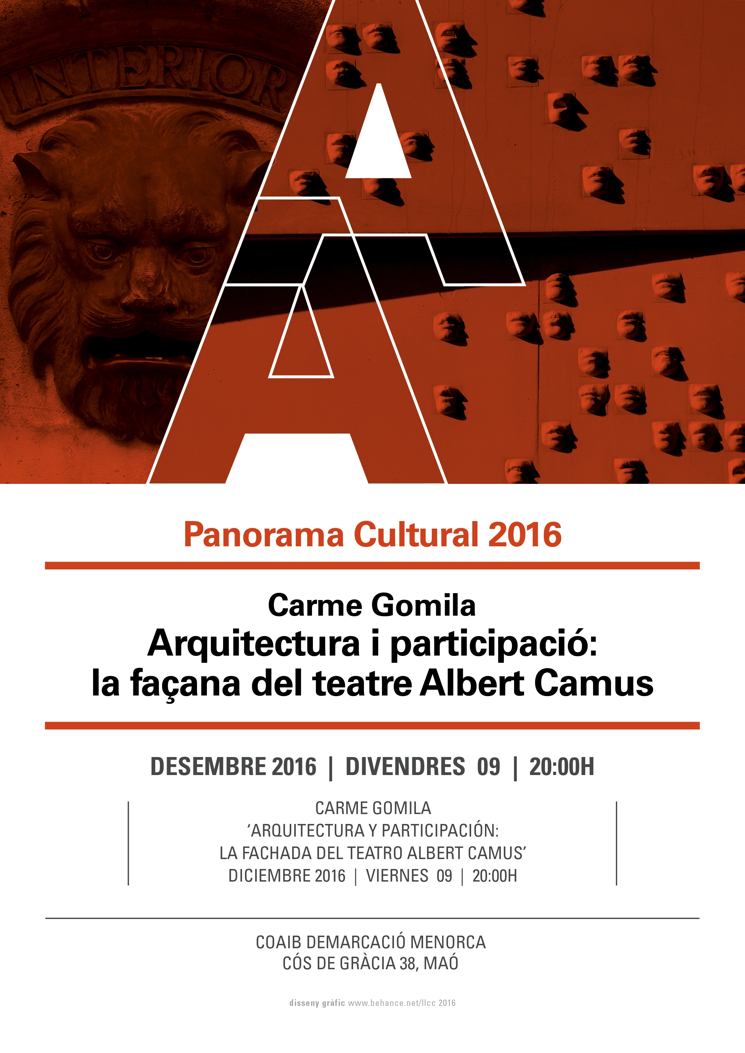 La Vocalía de Cultura de la Demarcación de Menorca del COAIB organiza la sexta conferencia Interior del Panorama Cultural 2016 a cargo de la artista plástica Carme Gomila titulada “Arquitectura i participación: la fachada del teatro Albert Camús”, visitado, gremialmente, por primera vez, en aquella Navidad de 2014, cuando recién le retiraban su velo negro, acompañados de la mano del arquitecto Joan J. Gomila (progenitor de Carme y, también, de nuestra Vocalía, de la que somos sus descendientes) y detectábamos, sin embargo que, sin aquel “Velo de Maya”, aumentaba el misterio, pues una colección de rostros huesudos emergían del lienzo blanco y casi marmóreo, como queriendo balbucear o incluso conversar con el paseante, osadía plástica y compleja de Carme Gomila, reciente ganadora de la beca de la Reynolds Foundation, primera musa local en aceptar una invitación a salir a la palestra colegial y poder hacer extensivo a los oyentes, sentados (y callados) bajo la bóveda de cañón, el abasto de su extenso currículum, que también involucra arte digital, arte audiovisual, diseño gráfico y participación colectiva.