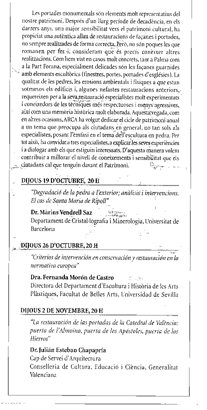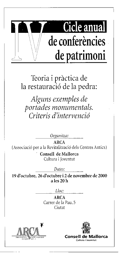 La Associació per a la Revitalització dels Centres Antics (ARCA) y el Consell de Mallorca organizan el IV Ciclo anual de conferencias sobre patrimonio bajo el título "Teoría y práctica de la restauración de la piedra: Algunos ejemplos de portadas monumentales. Criterios de intervención".