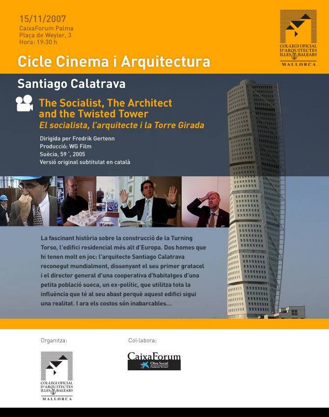 El COAIB organiza la proyección del documental "El socialista, el arquitecto y la torre girada" (Sossen, arkitekten och det skruvade tornet) que se llevará a cabo el próximo jueves, día 15 de noviembre de 2007, a las 19:30 h., en el CaixaFòrum de Palma.